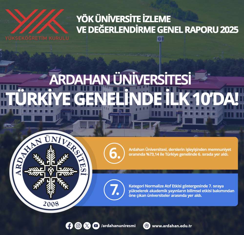 Konuya ilişkin değerlendirmelerde bulunan Rektörümüz Prof. Dr. Öztürk Emiroğlu, elde edilen başarının tesadüf olmadığını vurgulayarak, “YÖK tarafından yayımlanan bu rapor, üniversitemizin eğitim-öğretim kalitesi ile akademik üretim gücünün somut bir göstergesidir. Öğrenci memnuniyetinde ve bilimsel atıf etkisinde Türkiye genelinde ilk 10 içerisinde yer almak, doğru planlama ve kolektif emeğin sonucudur. Bu başarıda katkısı bulunan tüm akademik ve idari personelimize, öğrencilerimize teşekkür ediyorum. Ardahan Üniversitesi, kalite odaklı gelişimini kararlılıkla sürdürecektir” ifadelerini kullandı.