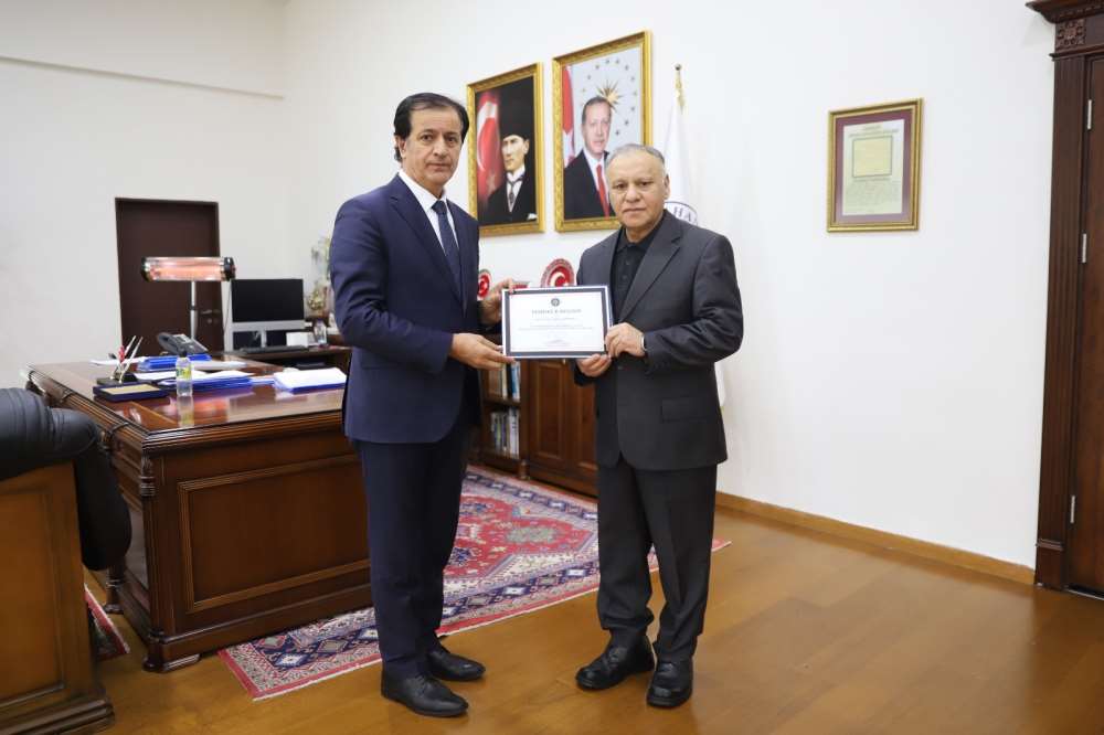Üniversitemizde uzun yıllar akademik görevlerde bulunarak bilim dünyasına ve kurumsal yapımıza katkı sunan Prof. Dr. Semra Çevik’e ve Prof. Dr. Şureddin Memmedli’ye, emeklilikleri dolayısıyla Rektörümüz Prof. Dr. Öztürk Emiroğlu tarafından Senato Odası’nda plaket ve hediye takdim edildi.