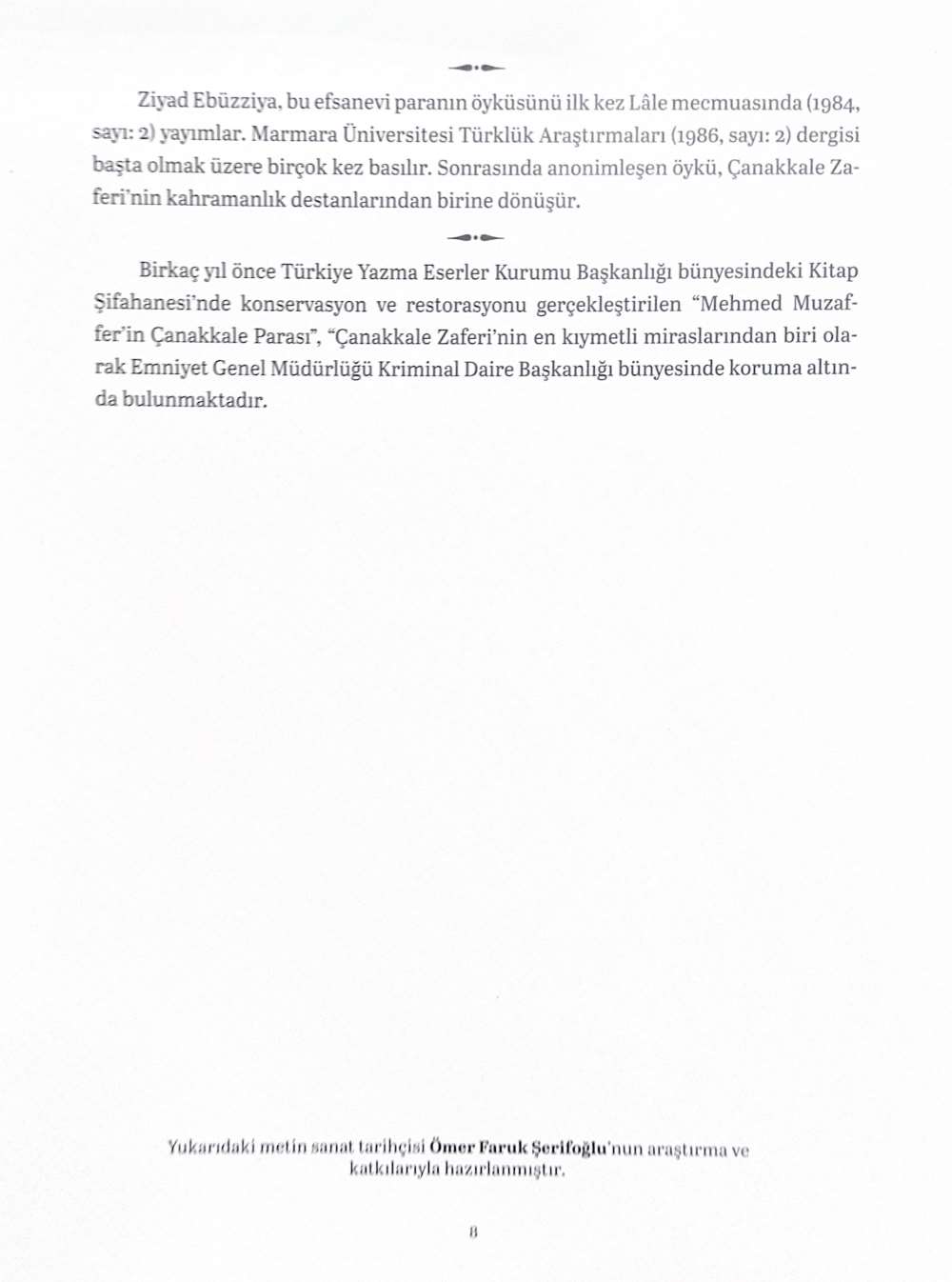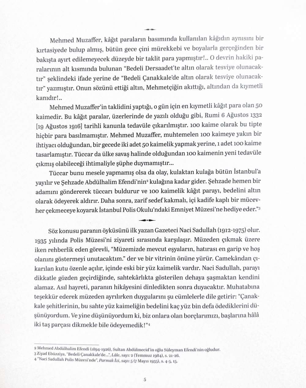 Eserde; Mehmed Muzaffer’in, cephede kullanılmak üzere temin edilen malzemelerin bedelini karşılayabilmek amacıyla dönemin 100 kaimelik kâğıt parasını büyük bir ustalıkla taklit etmesi, söz konusu paranın bir süre tedavülde kalması ve sonrasında meselenin devlet erkânına intikal etmesi süreci tarihî belgeler ışığında aktarılmaktadır. Ayrıca, paranın üzerinde yer alan “Bedeli Dersaadet’te altın olarak tesviye olunacaktır” ibaresinin, Muzaffer tarafından “Bedeli Çanakkale’de altın olarak tesviye olunacaktır” şeklinde değiştirilmesine dikkat çekilerek, bu ifadenin Çanakkale ruhunu ve fedakârlık anlayışını sembolize eden yönü vurgulanmaktadır.