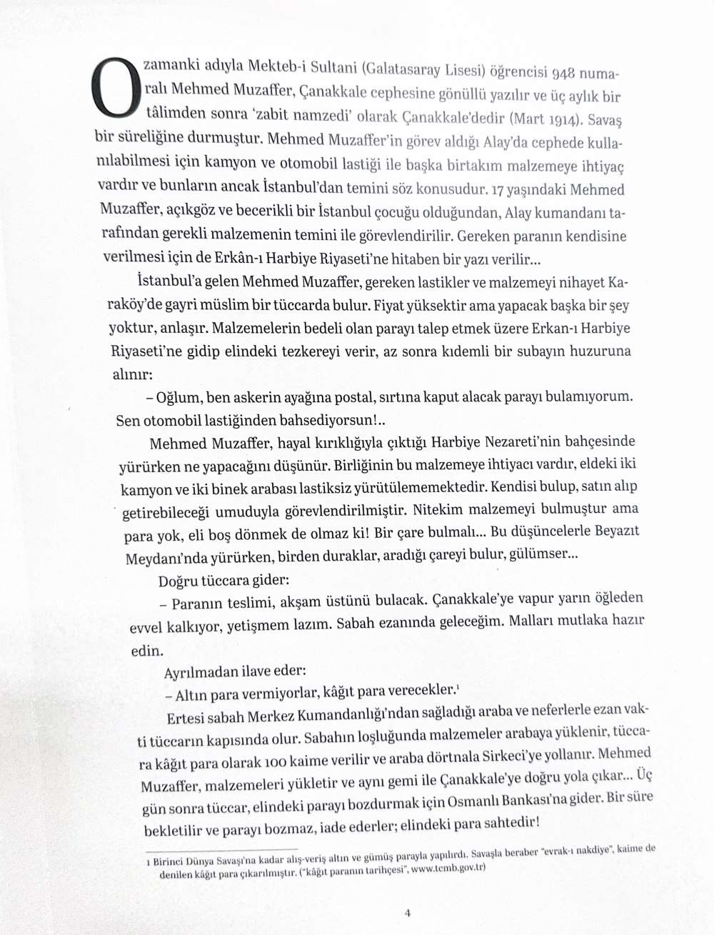 Takdim edilen eser, Çanakkale Cephesi’nde görev yapan Galatasaray Lisesi öğrencisi Mehmed Muzaffer’in, cephede ihtiyaç duyulan malzemelerin temini sürecinde yaşananları ve bu süreçte ortaya çıkan, Osmanlı para tarihinin en dikkat çekici vakalarından biri olan “Mehmed Muzaffer’in Çanakkale Parası” hadisesini ayrıntılı biçimde ele almaktadır.