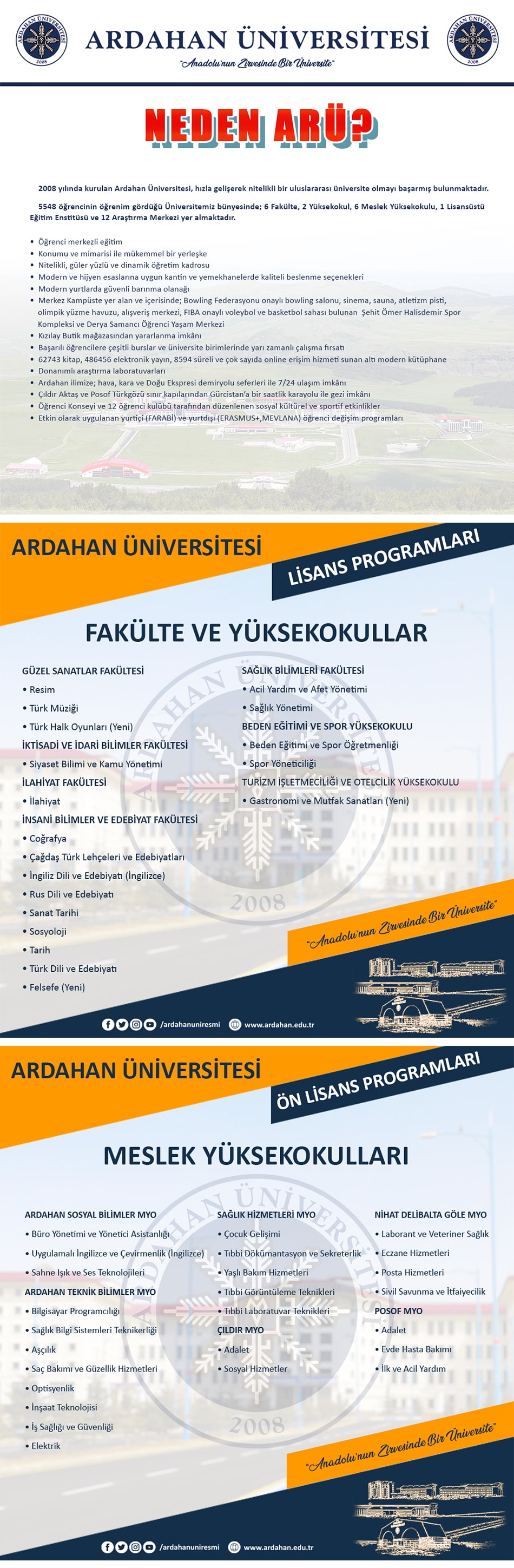 Ardahan Üniversitesi, 22 Mayıs 2008 de kurularak bir dünya üniversitesi olma yolunda ilk adımı atmıştır. Bilimin ve bilginin izinde, bilgiyi arayarak, öğrenerek, üreterek ve paylaşarak bölgenin ve ülkenin sorunlarıyla birlikte uluslararası toplumun da sorunlarını bir ışık gibi aydınlatmak amacıyla her geçen gün gelişerek yoluna devam etmektedir. Siz de bu gelişime ortak olun.