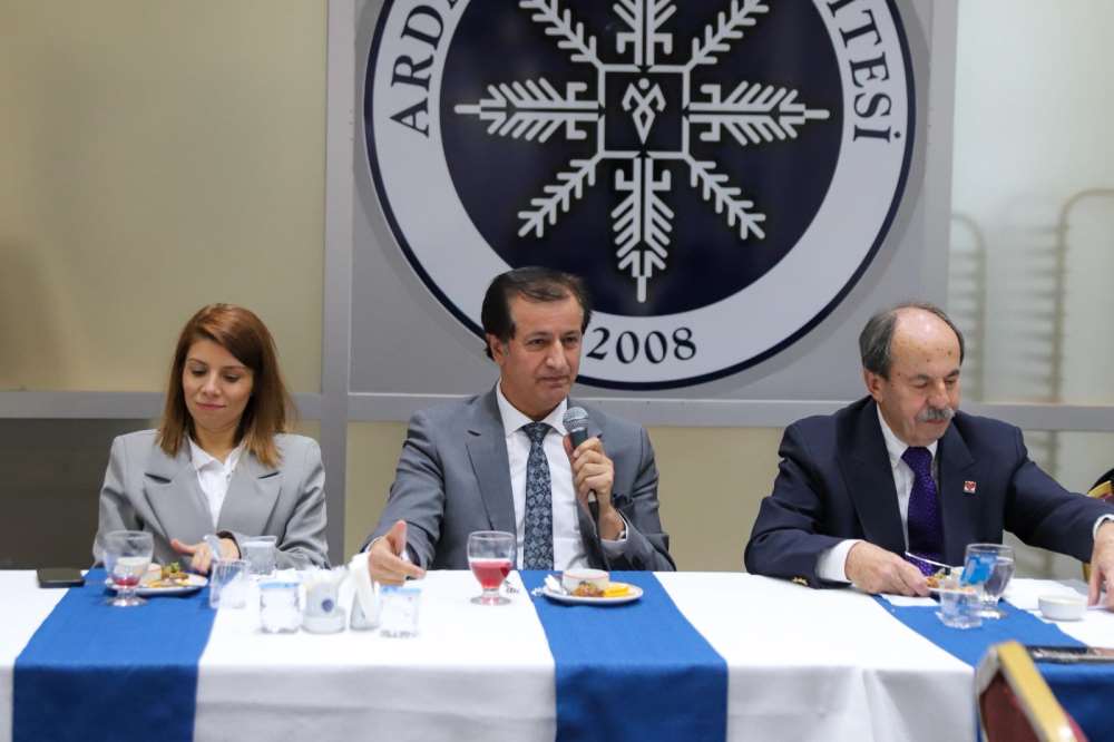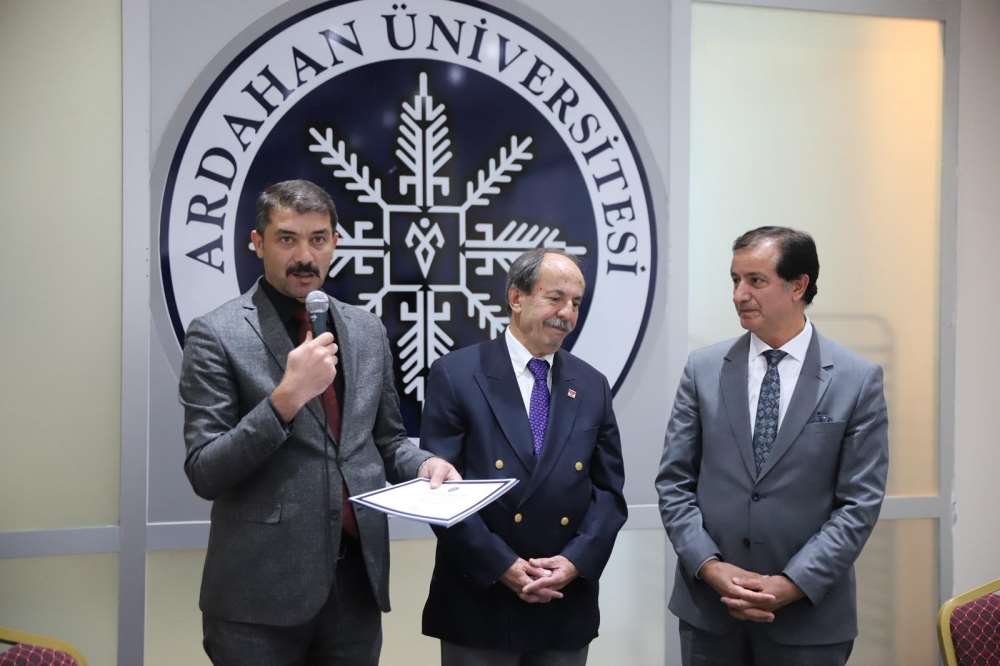 Prof. Dr. Mehmet Özkan konuşmasında, akademik hayatının önemli aşamalarını ve Ardahan Üniversitesi’ne uzanan yolculuğunu samimi bir dille anlattı. Koşuyolu Yüksek İhtisas Hastanesi’ndeki uzun mesleki sürecinin ardından Kars ve Ardahan’daki görev dönemlerine değinen Prof. Dr. Özkan; fakültenin kuruluş sürecinde birlikte çalıştığı dekan yardımcılarına, idari personele ve akademik kadroya teşekkür ederek duygusal anlar yaşadı. Konuşmasında ayrıca, tüm meslek yaşamı boyunca kendisine destek olan eşi Demet Özkan’a da özel olarak teşekkür etti.