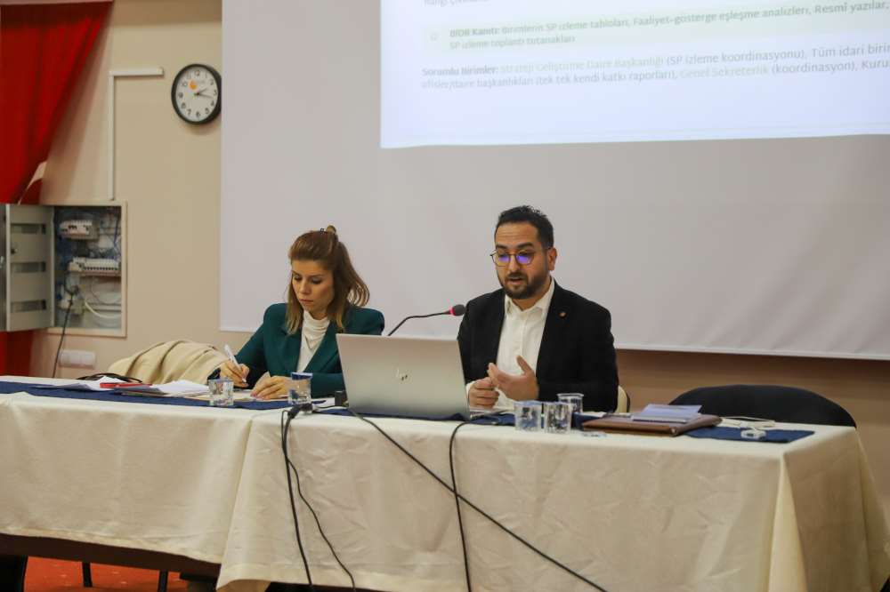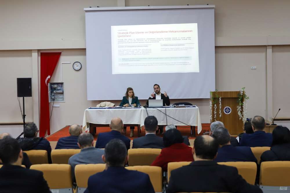 Kalite ve Akreditasyon Ofisi Koordinatörü Dr. Öğr. Üyesi Erman Kaçar ile Koordinatör Yardımcısı Dr. Öğr. Üyesi Tuğba Mert Emiroğlu tarafından verilen eğitimde; üniversitemizin 2025 yılı tamamlanmadan önce idari süreçlerde alması gereken önlemler, gelecek döneme yönelik kısa, orta ve uzun vadeli planlamalar ile liderlik ve yönetim, eğitim-öğretim, araştırma-geliştirme ve toplumsal katkı başlıklarında idari birimlerden beklenen çalışmalar ele alındı.