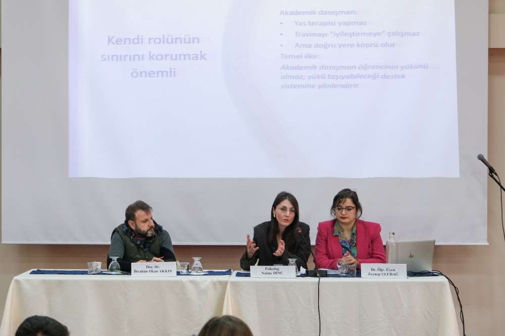 Üniversitemizde öğrenci danışmanlığı yapan akademisyenlere yönelik eğitimde, akademik danışmanlığın üniversite yaşamındaki rolü, psikolojik farkındalık ve doğru yönlendirme süreçleri ele alındı. Programda, öğrencilerin karşılaşabildiği duygusal, akademik ve psiko-sosyal sorunlar karşısında izlenmesi gereken yaklaşımlar değerlendirildi.