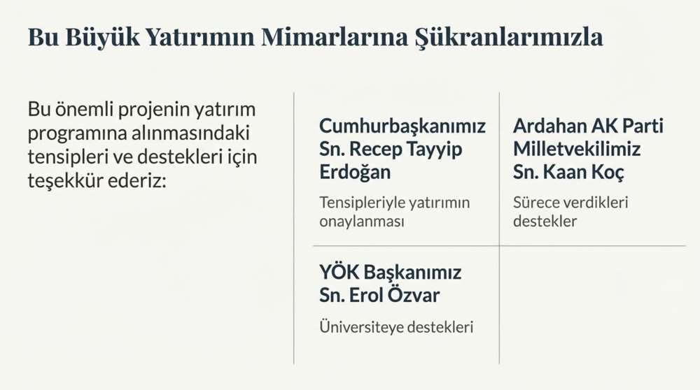 Bu kapsamda, yatırımın hayata geçirilmesinde sağlanan desteklerin önemine de dikkat çeken Rektörümüz Prof. Dr. Öztürk Emiroğlu, Cumhurbaşkanımız Sayın Recep Tayyip Erdoğan’ın tensipleriyle yatırım programına alınan bu önemli proje dolayısıyla, Üniversitemiz ve şehrimiz adına kendilerine şükranlarını arz ettiğini belirtti. Sürece verdikleri desteklerden dolayı Ardahan AK Parti Milletvekilimiz Sayın Kaan Koç’a, üniversitemize desteklerinden dolayı YÖK başkanımız Sayın Erol Özvar Bey’e teşekkür etti. Bu projeye katkı sunan Sayın Hayati Başaran’a da şehrimiz adına teşekkür etti.