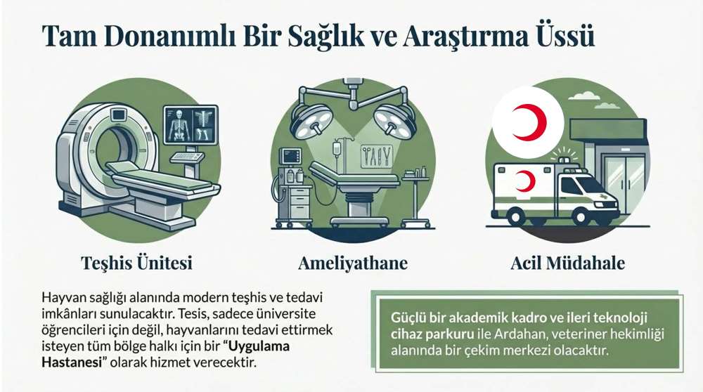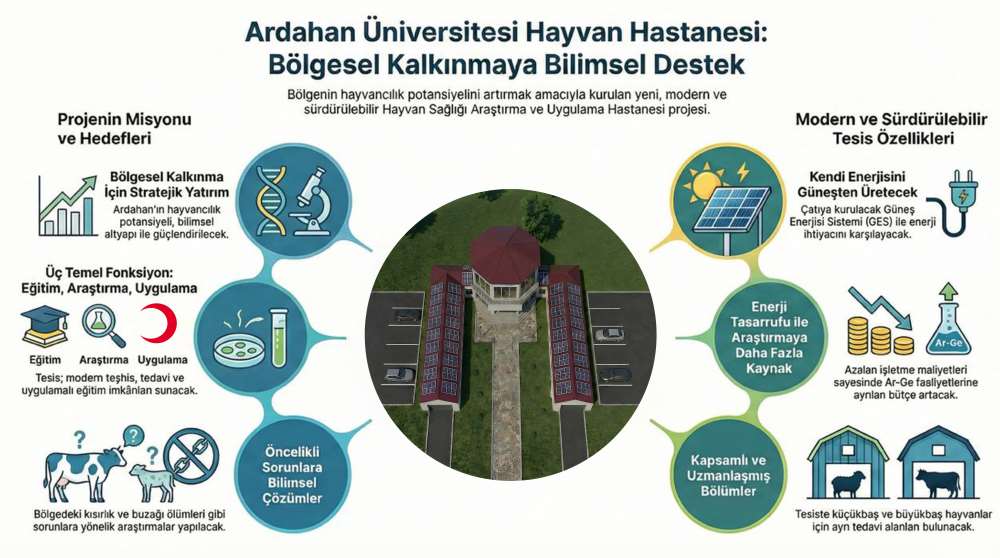 Ardahan’ın tarım ve hayvancılık potansiyelini bilimsel altyapıyla buluşturmayı hedefleyen proje, bölgesel kalkınmaya katkı sunacak stratejik bir yatırım olarak değerlendirilmektedir. Eğitim, araştırma ve uygulama faaliyetlerini bir arada yürütecek şekilde planlanan hastane; hayvan sağlığı alanında modern teşhis ve tedavi imkânları sunmasının yanı sıra, uygulamalı eğitim ve bilimsel araştırmalar için de güçlü bir zemin oluşturacaktır. Bu yönüyle yatırımın, üniversitemizin akademik kapasitesine ve bölge hayvancılığının gelişimine önemli katkılar sağlaması hedeflenmektedir.