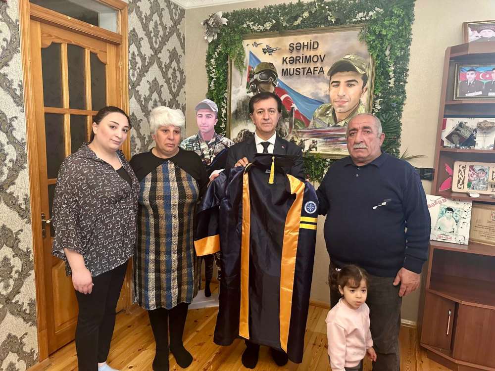 Rektörümüz Prof. Dr. Öztürk Emiroğlu, Azerbaycan'ın başkenti Bakü’de, 2020 yılında gerçekleşen II. Karabağ Savaşı’nda şehit düşen Üniversitemiz öğrencisi Mustafa Kerimov’un kederli ailesiyle bir araya geldi. Şehidimizin aziz hatırasını yaşatmak adına gerçekleştirilen bu anlamlı ziyarette Rektörümüz Prof. Dr. Öztürk Emiroğlu, Mustafa Kerimov’un giymeye hak kazandığı mezuniyet cübbesini ve kepini, öğrencimizin üniversitedeki başarısının ve vatanseverliğinin birer ebedi nişanesi olarak ailesine bizzat teslim etti. Duygu dolu anların yaşandığı takdim töreni, şehidimizin kendisi için oluşturulan anı köşesinin önünde gerçekleştirildi.
