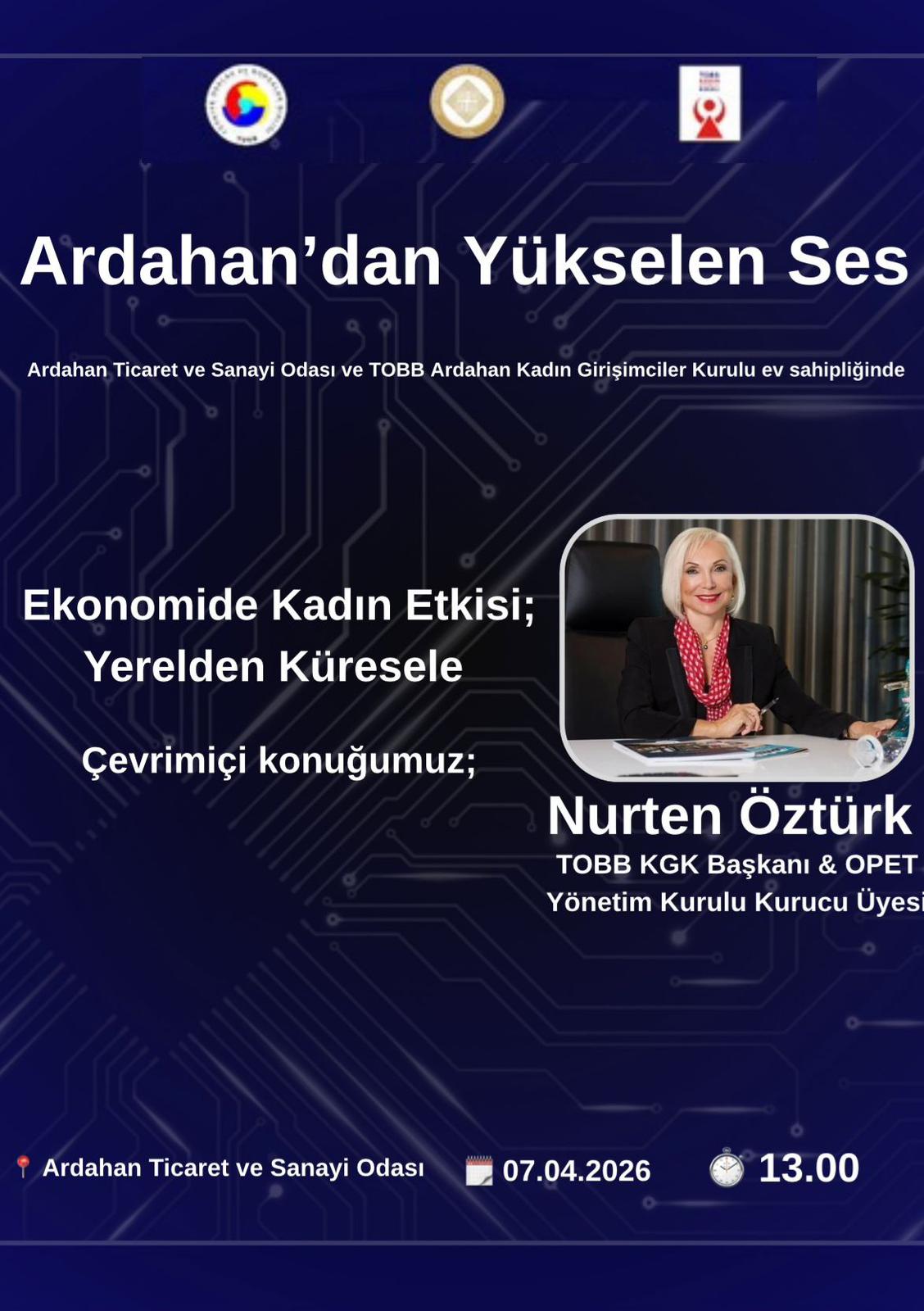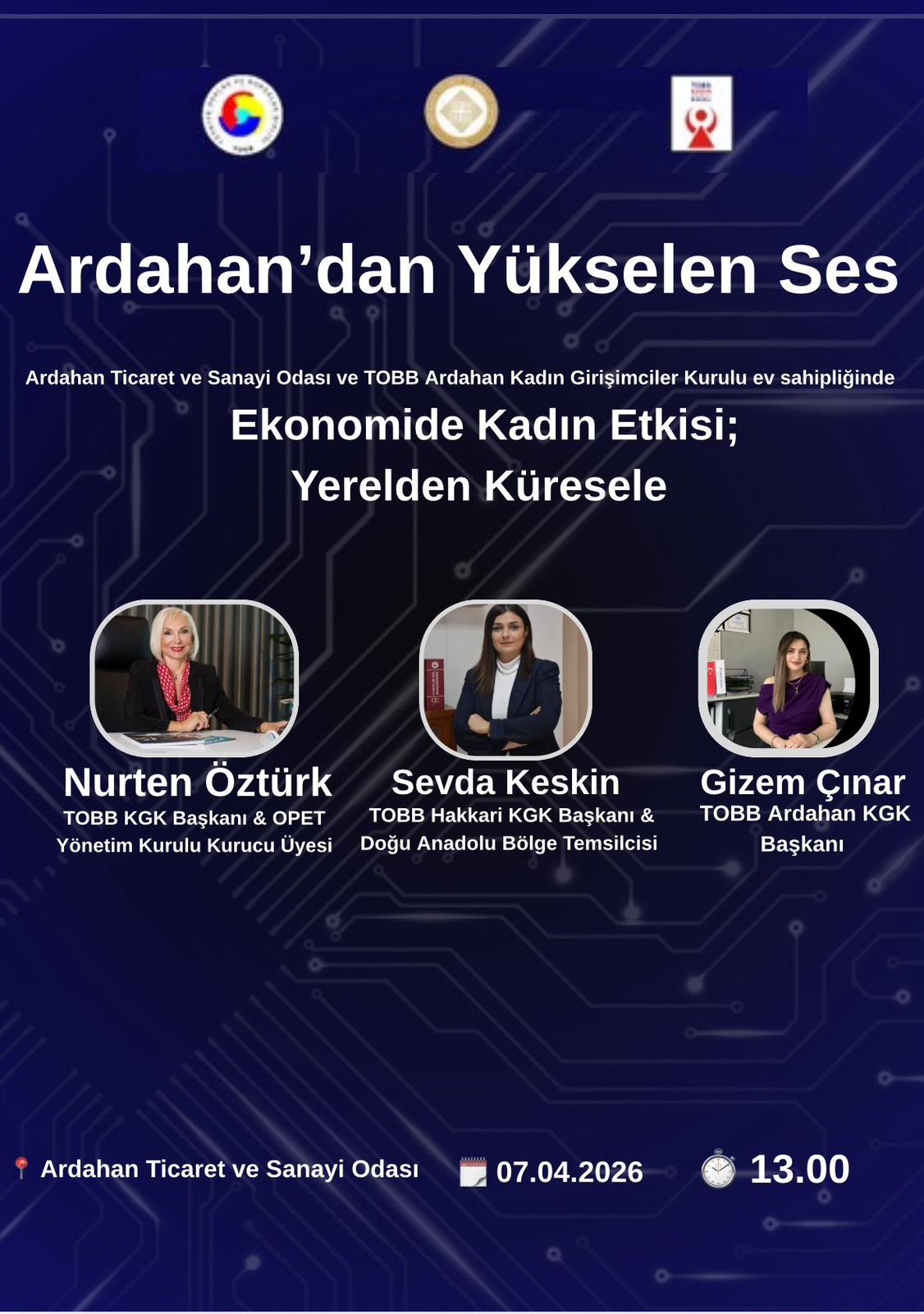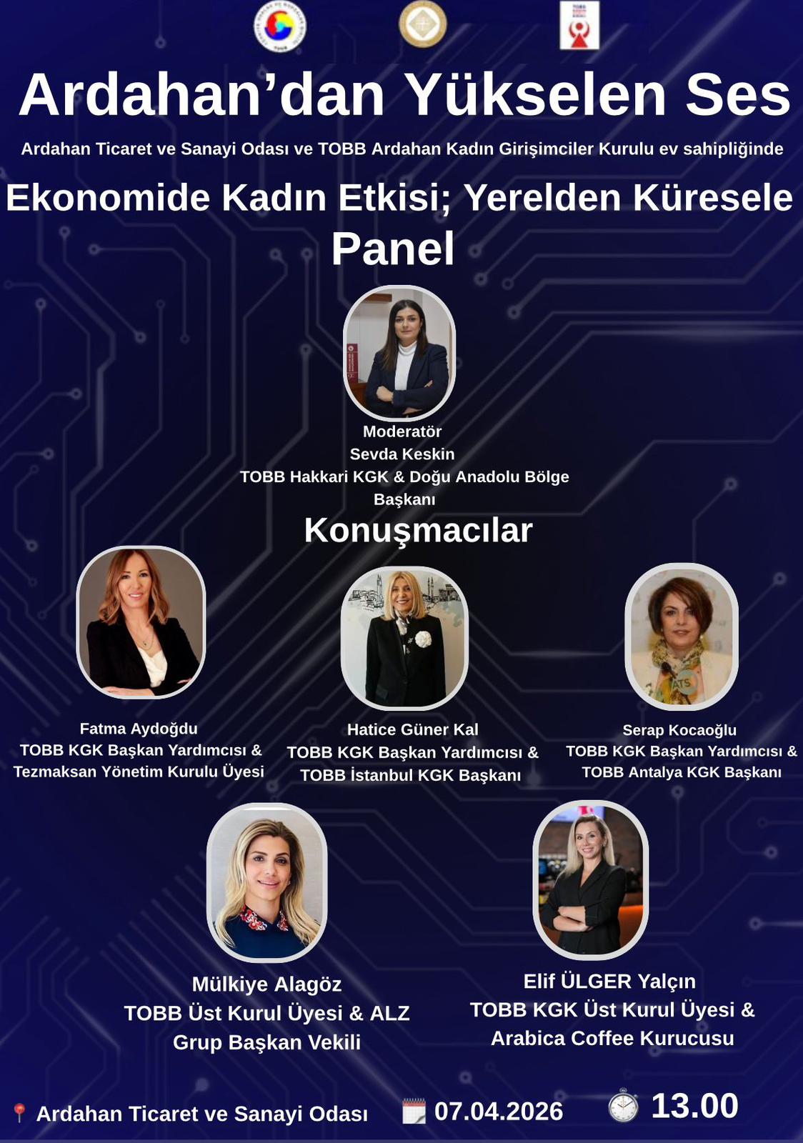 Ardahan Ticaret ve Sanayi Odası ile TOBB Ardahan Kadın Girişimciler Kurulu ev sahipliğinde ve "Zirvede Kadın Var!" Platformu iş birliğiyle; eşitliğin, ilhamın ve ekonomik dönüşümün sahnesi olacak "Ekonomide Kadın Etkisi; Yerelden Küresele" paneli gerçekleştirilecektir.