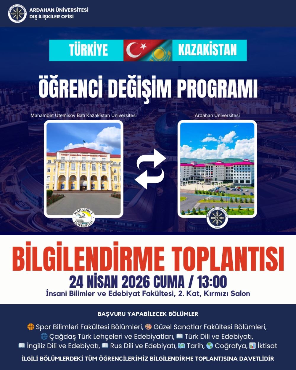 Üniversitemiz ile Kazakistan’da bulunan Mahambet Utemisov Batı Kazakistan Üniversitesi arasında imzalanan İkili İş Birliği Protokolü kapsamında, karşılıklı öğrenci değişim süreci başlatılmıştır. Bu protokol çerçevesinde, öğrencilerimize eğitim hayatlarının bir bölümünü Kazakistan’da sürdürme ve farklı bir akademik kültürü deneyimleme imkanı sunulacaktır. Söz konusu değişim programının şartları, başvuru süreci ve kontenjanlar hakkında detaylı bilgi vermek amacıyla bir