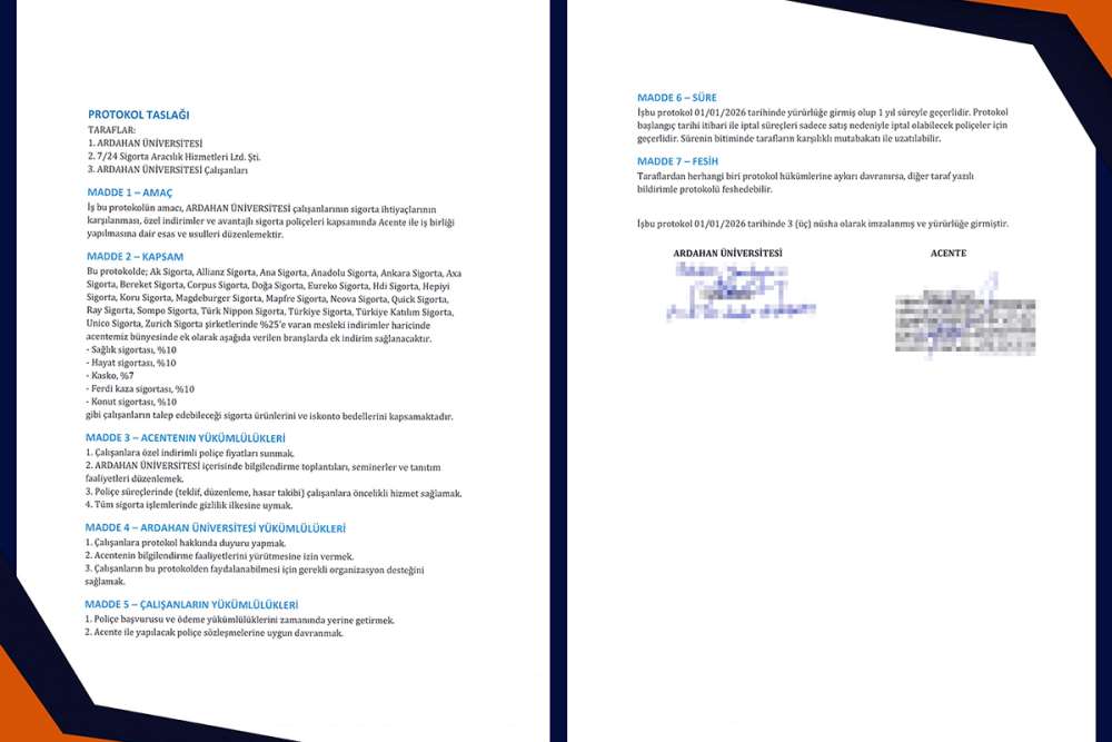 Ardahan Üniversitesi, mezunlarıyla bağlarını güçlendirmeye devam ediyor. 2014 yılında Üniversitemiz Siyaset Bilimi ve Kamu Yönetimi Bölümünden mezun olan öğrencimiz Yunus Emre Ergül tarafından kurulan 7/24 Sigorta Aracılık Hizmetleri Ltd. Şti. ile Üniversitemiz arasında iş birliği protokolü imzalandı. Protokol kapsamında Üniversitemiz çalışanlarına sağlık, hayat, kasko ve konut sigortası gibi branşlarda özel indirimli poliçeler sunulacaktır. Allianz, Anadolu Sigorta, Türkiye Sigorta ve Zurich Sigorta gibi sektörde önde gelen şirketlerin ürünlerini kapsayan anlaşma ile çalışanlarımız, %25’e varan mesleki indirimlerin yanı sıra %10’a kadar acente indirimiyle birlikte toplamda %35’e varan avantajdan yararlanabilecektir. Bu iş birliği, Üniversitemizin Mezun Takip Sistemi ile mezunlarımızla kurduğu güçlü bağların bir göstergesi olarak önem taşımaktadır.