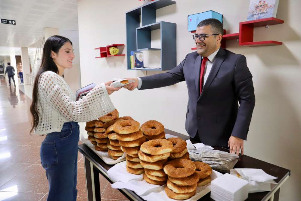 Üniversitemiz İktisadi ve İdari Bilimler Fakültesi (İİBF), akademik yoğunluğun arttığı vize haftasında öğrencilerin motivasyonunu artırmak ve kurumsal aidiyeti güçlendirmek amacıyla anlamlı bir etkinlik düzenledi. 31 Mart 2026 tarihinde İİBF kantin girişinde gerçekleştirilen bu etkinlikte öğrencilere ücretsiz simit ve çay ikram edildi. Dağıtıma katılarak öğrencilerle bir araya gelen İİBF Dekanı Prof. Dr. Ali Kemal Çelik, göreve geldikleri günden bu yana öğrenci odaklı bir yaklaşım benimsediklerini vurgulayarak; “Temel gayemiz, öğrencilerimizi fakülte kültürüne dâhil etmek, aramızdaki bağları güçlendirmek ve fakültemizi öğrencilerimiz için daha cazip bir yaşam alanı haline getirmektir” ifadelerini kullandı.