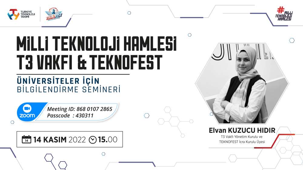 14 Kasım Pazartesi günü saat 15:00’ da T3 Vakfı Yönetim Kurulu Üyesi ve TEKNOFEST İcra kurulu üyesi sayın Elvan Kuzucu HIDIR’ ın sunumuyla TEKNOFEST 2023 bilgilendirme semineri gerçekleşecektir.