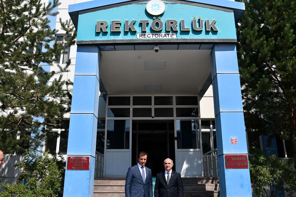 Üniversitemiz Rektörü Prof. Dr. Öztürk Emiroğlu, Kafkas Üniversitesi Rektörü Prof. Dr. Hüsnü Kapu’ya resmî ziyarette bulundu. Program çerçevesinde Kafkas Üniversitesi Veteriner Fakültesi, Hayvan Hastanesi ve çeşitli araştırma laboratuvarları ziyaret edilerek yürütülen akademik ve uygulamalı çalışmalar hakkında bilgi alındı. Rektörümüz Prof. Dr. Öztürk Emiroğlu’na ziyareti sırasında üniversitemiz Genel Sekreteri Kubilay Aras eşlik etti. Ziyaret, iki üniversite arasındaki kurumsal ilişkilerin güçlendirilmesi ve ortak bilimsel faaliyetlerin teşvik edilmesi açısından verimli bir zeminde gerçekleşti.