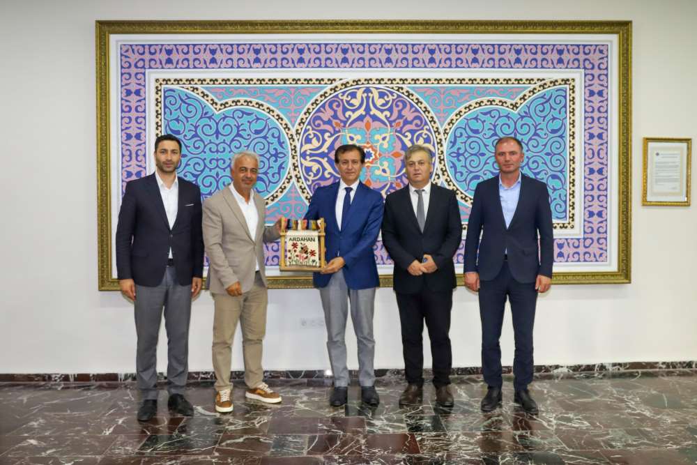 Ardahan İl Özel İdaresi Genel Sekreter Yardımcısı Levent Dursun, İnsan Kaynakları Müdürü İsrafil Bölük, Yazı İşleri Müdürü Fevzi Bozkurt ile İşletme ve İştirakler Müdürü Hükümdar Baydar, Üniversitemiz Rektörü Prof. Dr. Öztürk Emiroğlu’nu makamında ziyaret etti. Ziyaret sırasında İl Özel İdaresi yetkilileri, Rektörümüze “Ardahan” yazılı minyatür bir halı hediye etti. Rektörümüz, nazik ziyaretleri ve anlamlı hediyeleri dolayısıyla İl Özel İdaresi yetkililerine teşekkür ederek, üniversitemizin kamu kurumlarıyla iş birliğine büyük önem verdiğini ifade etti. Ziyaret, karşılıklı iyi dileklerin paylaşılmasının ardından hatıra fotoğrafı çekimiyle sona erdi.