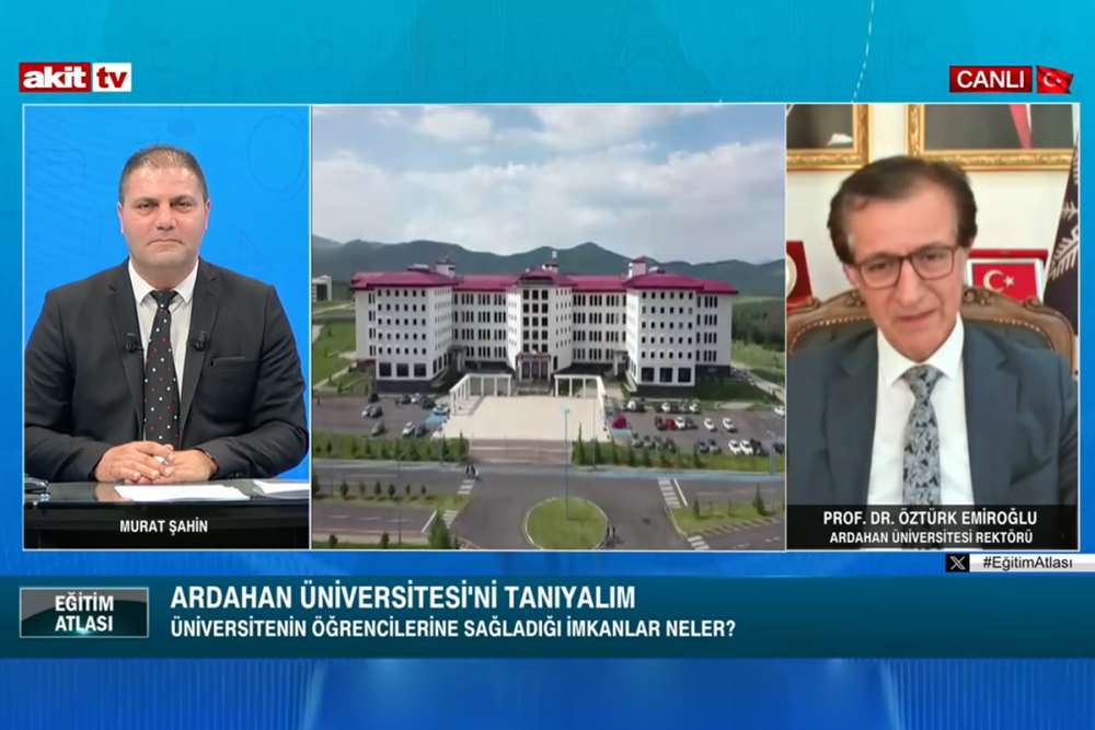Rektörümüz Prof. Dr. Öztürk Emiroğlu, Akit TV’de yayınlanan “Eğitim Atlası” programında üniversitemizin akademik vizyonunu, öğrencilere sunduğu imkânları, bölgesel kalkınmaya katkı projelerini ve geleceğe yönelik hedeflerini anlattı. Tarım ve hayvancılık alanında ihtisaslaşma planlarından uluslararası iş birliklerine kadar birçok başlık canlı yayında kamuoyuyla paylaşıldı. Prof. Dr. Emiroğlu, üniversitemizin serhat şehri Ardahan’da, Kafkasya’ya açılan stratejik bir konumda yer aldığını vurgulayarak, “Doğayla iç içe huzurlu kampüsümüzde, genç ve dinamik akademik kadromuzla öğrencilerimize nitelikli bir eğitim sunuyoruz. Misyonumuz, yerel değerlerle evrensel bilgi arasında köprü kurmak” dedi.