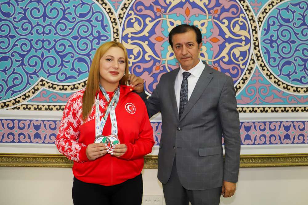 Rektörümüz Prof. Dr. Öztürk Emiroğlu, Bulgaristan’da düzenlenen Dünya Bilek Güreşi Şampiyonası’nda sol kolda dünya ikincisi, sağ kolda ise üçüncü olarak bir gümüş ve bir bronz madalya kazanan Ardahanlı sporcu Aybüke Yıldız’ı ağırladı. Rektörlük makamında gerçekleşen ziyarette Üniversitemiz Sağlık, Kültür ve Spor Daire Başkanı Metin Çimli, sporcumuzun babası ve antrenörü Gürbüz Yıldız ile akademisyenimiz Dr. Öğr. Üyesi Meral Demir hazır bulundu. Aybüke Yıldız’ı tebrik eden Rektörümüz, sporcumuza hediye takdiminde bulundu. Ziyaret, hatıra fotoğrafının çekilmesinin ardından sona erdi.