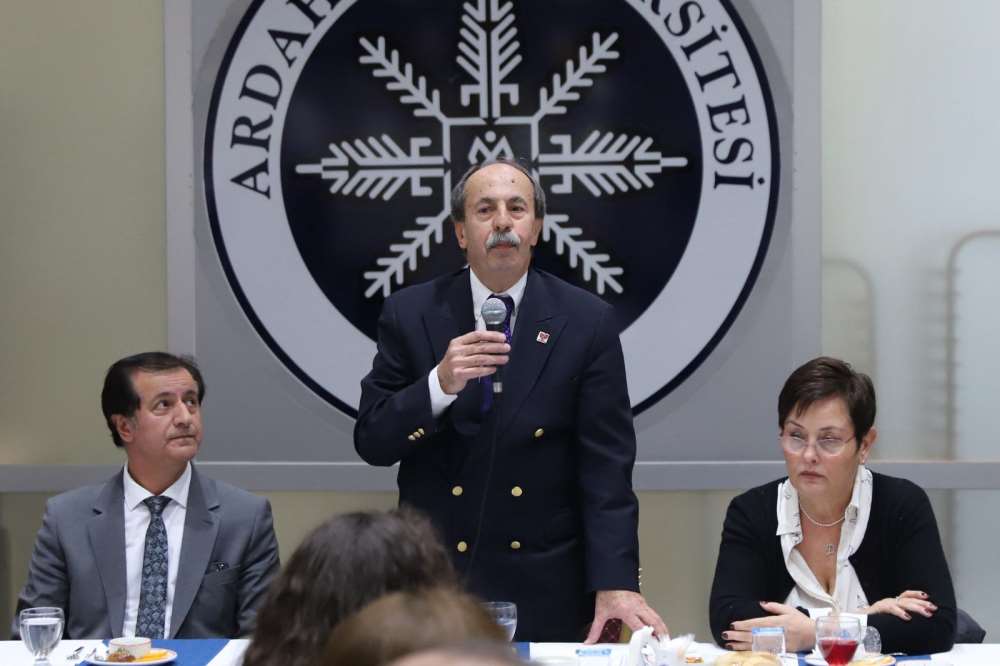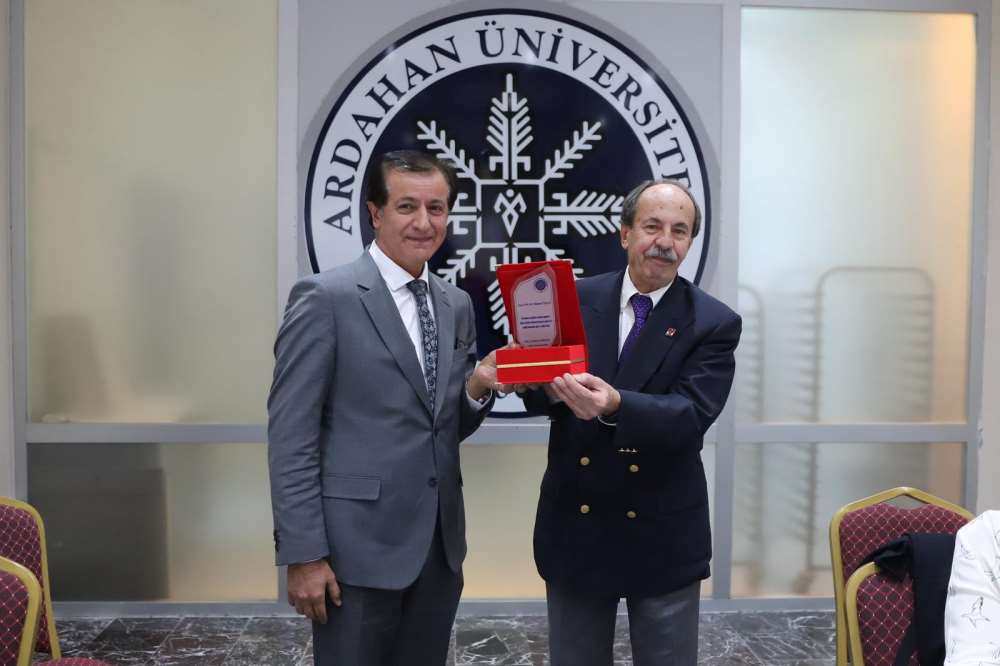 Prof. Dr. Mehmet Özkan konuşmasında, akademik hayatının önemli aşamalarını ve Ardahan Üniversitesi’ne uzanan yolculuğunu samimi bir dille anlattı. Koşuyolu Yüksek İhtisas Hastanesi’ndeki uzun mesleki sürecinin ardından Kars ve Ardahan’daki görev dönemlerine değinen Prof. Dr. Özkan; fakültenin kuruluş sürecinde birlikte çalıştığı dekan yardımcılarına, idari personele ve akademik kadroya teşekkür ederek duygusal anlar yaşadı. Konuşmasında ayrıca, tüm meslek yaşamı boyunca kendisine destek olan eşi Demet Özkan’a da özel olarak teşekkür etti.