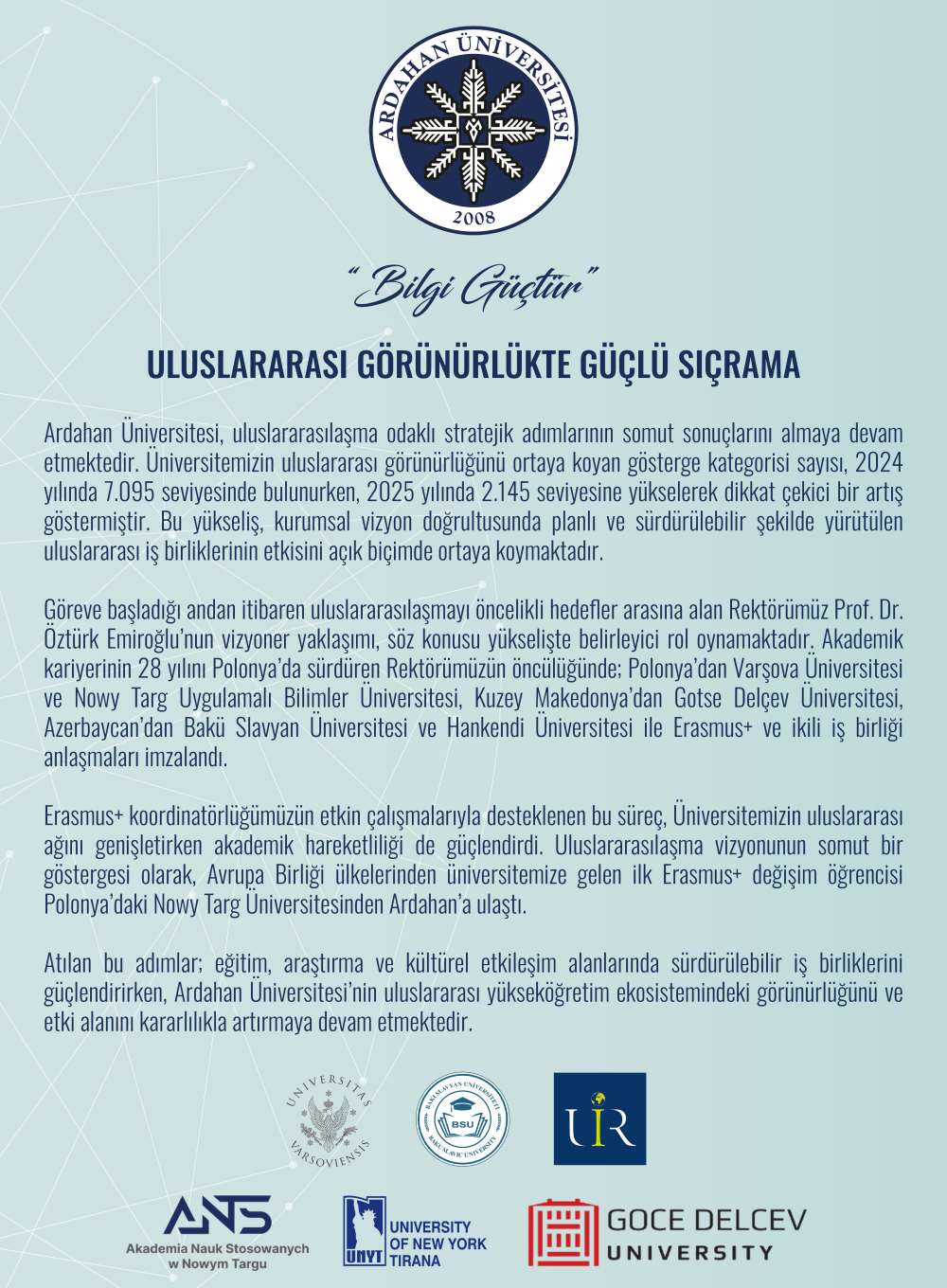 Göreve başladığı andan itibaren uluslararasılaşmayı öncelikli hedefler arasına alan Rektörümüz Prof. Dr. Öztürk Emiroğlu’nun vizyoner yaklaşımı, söz konusu yükselişte belirleyici rol oynamaktadır. Akademik kariyerinin 28 yılını Polonya’da sürdüren Rektörümüzün öncülüğünde; Polonya’dan Varşova Üniversitesi ve Nowy Targ Uygulamalı Bilimler Üniversitesi, Kuzey Makedonya’dan Gotse Delçev Üniversitesi, Azerbaycan’dan Bakü Slavyan Üniversitesi ve Hankendi Üniversitesi ile Erasmus+ ve ikili iş birliği anlaşmaları imzalandı.