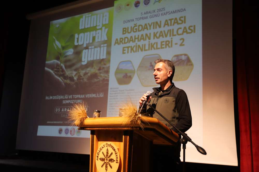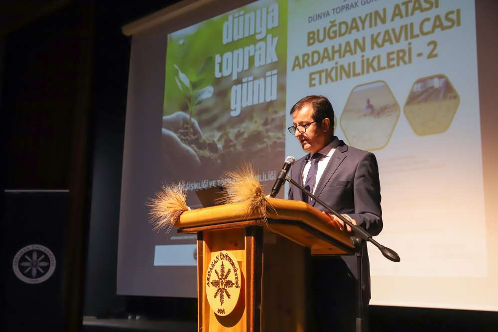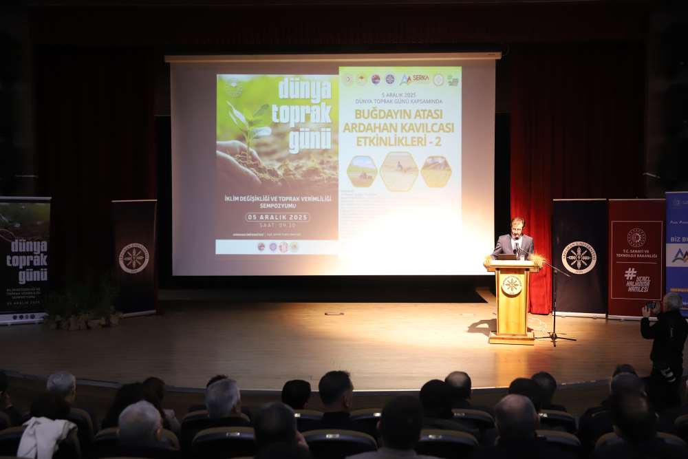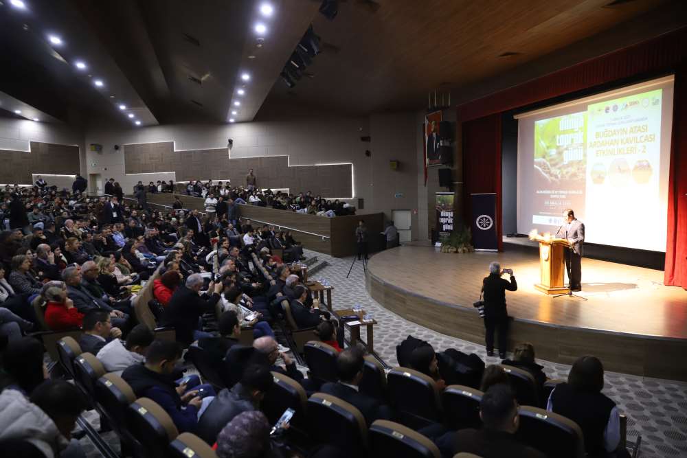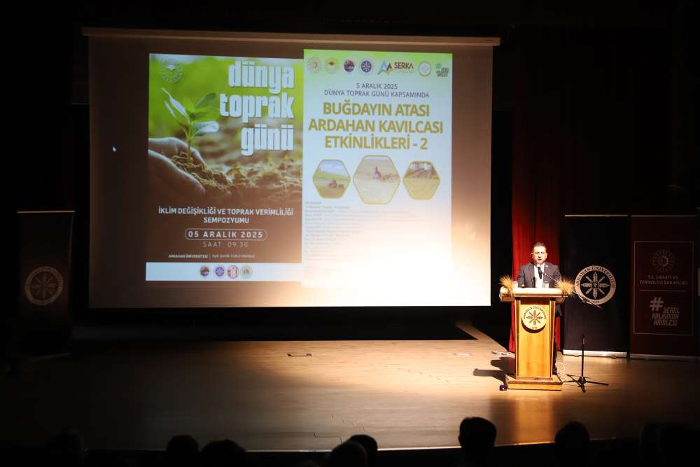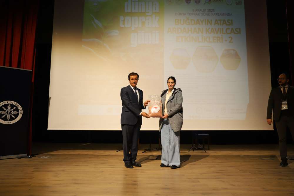Üniversitemiz, 5 Aralık Dünya Toprak Günü kapsamında “Buğdayın Atası Ardahan Kavılcası Etkinlikleri – 2” programına ev sahipliği yaptı. Aşık Şenlik Kültür Merkezi’nde düzenlenen etkinliğe; Ardahan Vali Vekili Mustafa Berat Kasımoğlu, Rektörümüz Prof. Dr. Öztürk Emiroğlu, Rektör Yardımcımız Prof. Dr. Mustafa Yıldız, Genel Sekreterimiz H. Caner Akkurt, Tarım ve Orman Bakanlığı Yayın ve Tanıtım Hizmetleri Daire Başkanı Şaban Özakın, Ardahan Tarım ve Orman İl Müdürü M. Fatih Cineviz, Ardahan Ticaret ve Sanayi Odası Başkanı Çetin Demirci, SERKA Ardahan Koordinatörü Eren Yurtalan, Erzurum Orman Bölge Müdürü Serkan Karakurt, akademik ve idari personel, panelistler, basın temsilcileri ve çok sayıda öğrenci katıldı. Programa katılamayan AK Parti Ardahan Milletvekili Kaan Koç ile CHP Ardahan Milletvekili Özgür Erdem İncesu, gönderdikleri mesajlarda etkinliğin önemine vurgu yaparak başarı dileklerini iletti. Protokol konuşmalarında Kavılca buğdayının bölgesel değeri vurgulandı. Programın açılışında konuşan Ardahan Tarım ve Orman İl Müdürü M. Fatih Cineviz, uluslararası tartışmalarda giderek daha fazla yer bulan “gıda milliyetçiliği” kavramına dikkat çekerek, günümüzde gıda arz güvenliğinin ülkelerin ekonomik kapasitesinden bağımsız biçimde kırılganlaştığını vurguladı. Rusya–Ukrayna Savaşı ile birliktebu kırılganlığın küresel ölçekte somut biçimde görüldüğünü belirten Cineviz, Tarım ve Orman Bakanlığı’nın son iki yıldır yürüttüğü üretim planlaması çalışmalarının bu nedenle stratejik bir önem taşıdığını ifade etti. Ardahan Ticaret ve Sanayi Odası Başkanı Çetin Demirci ise Kavılca buğdayının yalnızca bölgenin kadim bir tarım ürünü değil, aynı zamanda Ardahan’ın geleceğe dönük ekonomik vizyonunda yer alması gereken stratejik bir marka değeri olduğunu dile getirdi. Demirci, Kavılcanın işlenmesi, ambalajlanması ve katma değer üreten bir ürün haline getirilmesinin, şehrin ekonomik büyümesine doğrudan katkı sağlayacak önemli bir fırsat olduğunu belirtti. Erzurum Orman Bölge Müdürü Serkan Karakurt ise, iklim değişikliğiyle mücadele eden güncel ormancılık uygulamalarını anlattı.