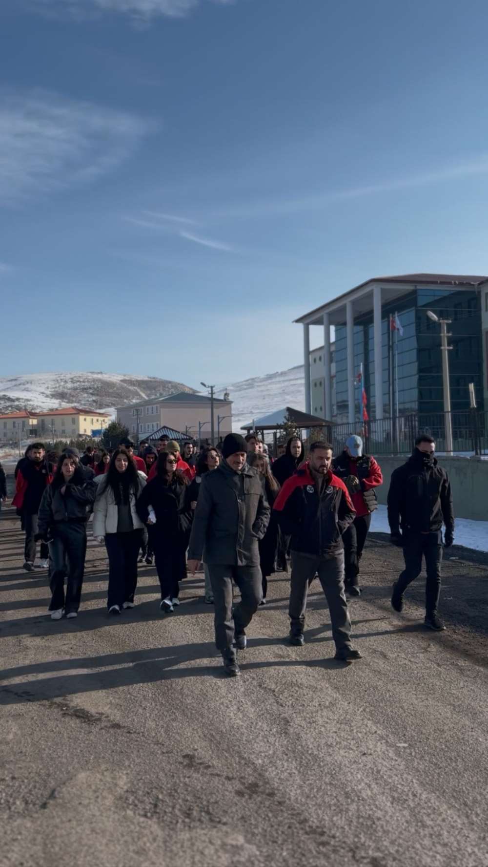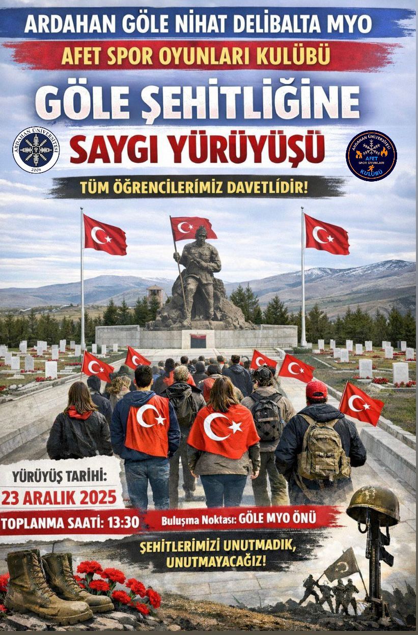 Üniversitemiz Nihat Delibalta Göle Meslek Yüksekokulu Sivil Savunma ve İtfaiyecilik Programı bünyesinde faaliyet gösteren Afet Spor Oyunları Kulübü tarafından Göle Şehitliği’ne saygı yürüyüşü düzenlendi. Zorlu iklim koşullarına rağmen gerçekleştirilen etkinlikte, vatan uğruna hayatını kaybeden şehitlerimiz dualarla anıldı; şehir anıtı ziyaretiyle millî birlik, toplumsal sorumluluk ve insan hayatını merkeze alan meslek bilinci vurgulandı.