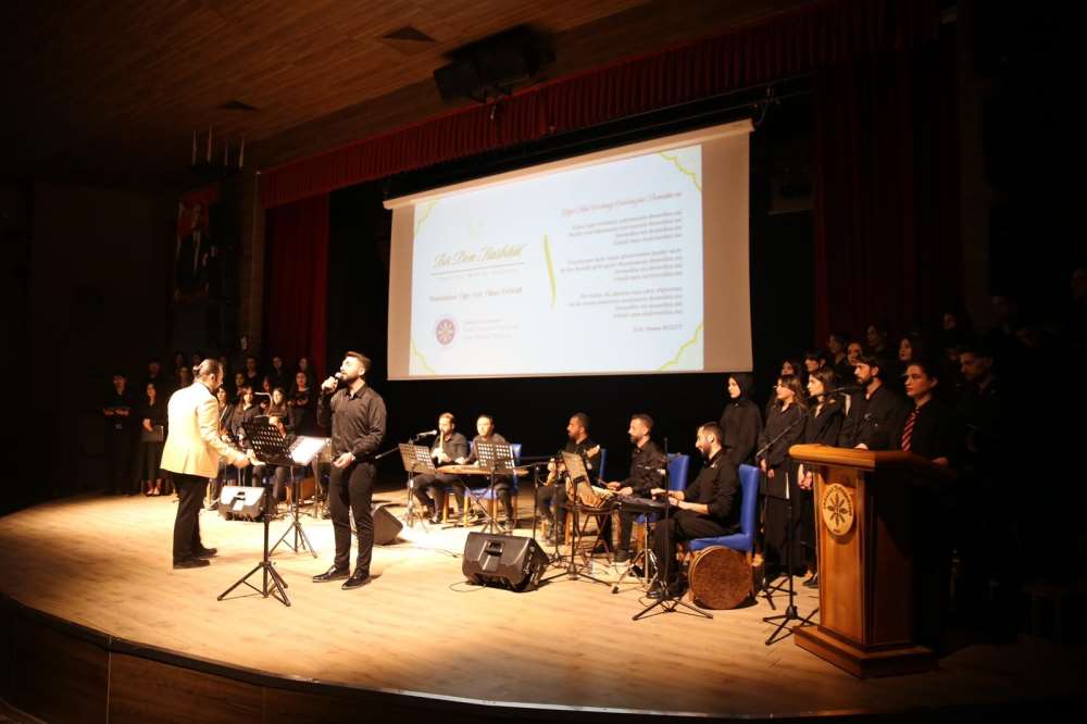 Üniversitemiz Güzel Sanatlar Fakültesi Türk Müziği Bölümü bünyesinde düzenlenen "Bir Dem Hasbihâl" başlıklı tasavvuf müziği konseri, Âşık Şenlik Kültür Merkezinde gerçekleştirildi. Genel sanat yönetmenliğini Öğr. Gör. Okan Yanar’ın üstlendiği ve bölümümüzün katkılarıyla hazırlanan etkinlikte, Türk musikisinin köklü makam yapısı ile tasavvuf kültürünün estetik derinliği usta icralarla dinleyicilere aktarıldı. Ney ve kudüm gibi geleneksel enstrümanların eşlik ettiği dinleti; titizlikle hazırlanan repertuvarı ve manevi atmosferiyle katılımcılardan büyük ilgi gördü. Üniversitemiz personeli, öğrencilerimiz ve halkın yoğun katılım sağladığı etkinlik, günün anısına gerçekleştirilen toplu fotoğraf çekimi ile sona erdi.