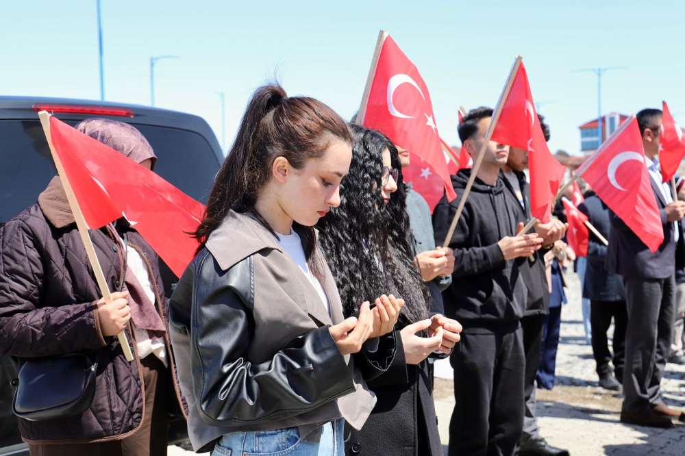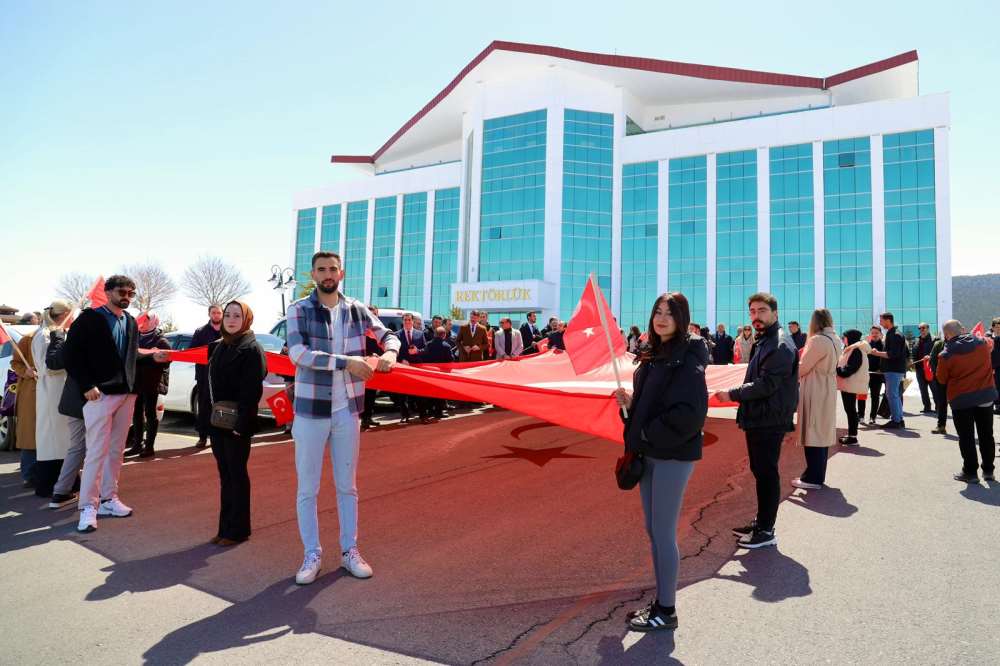 Üniversitemiz, vatanımızın birliği ve beraberliği uğruna canlarını feda eden aziz şehitlerimizi anmak üzere 17 Nisan 2026 tarihinde anlamlı bir yürüyüşe ev sahipliği yaptı. Rektörümüz Prof. Dr. Öztürk Emiroğlu’nun teşrifleri, Rektör Yardımcılarımız, akademik ve idari personelimiz ile öğrencilerimizin katılımıyla düzenlenen anma etkinliği, Rektörlük binası önünden başlayarak kampüs genelinde dev Türk bayrağı eşliğinde gerçekleştirilen yürüyüşle devam etti. Hoca Ahmet Yesevi Camisi önünde tamamlanan yürüyüşün ardından, anma töreni kapsamında aziz şehitlerimizin ruhuna ithafen Kur’an-ı Kerim tilaveti okunarak hep birlikte dualar edildi.