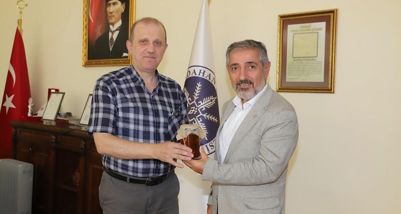 Karadeniz Teknik Üniversitesi Rektörü Prof. Dr. Hamdullah Çuvalcı Rektörümüz Prof. Dr. Mehmet Biber’i makamında ziyaret etti. Sohbet şeklinde gerçekleşen ziyaretin ardından Rektörümüz nazik ziyaretlerinden dolayı duyduğu memnuniyeti dile getirerek Rektör Prof. Dr. Çuvalcı’ya teşekkür ederek hediye takdiminde bulundu.