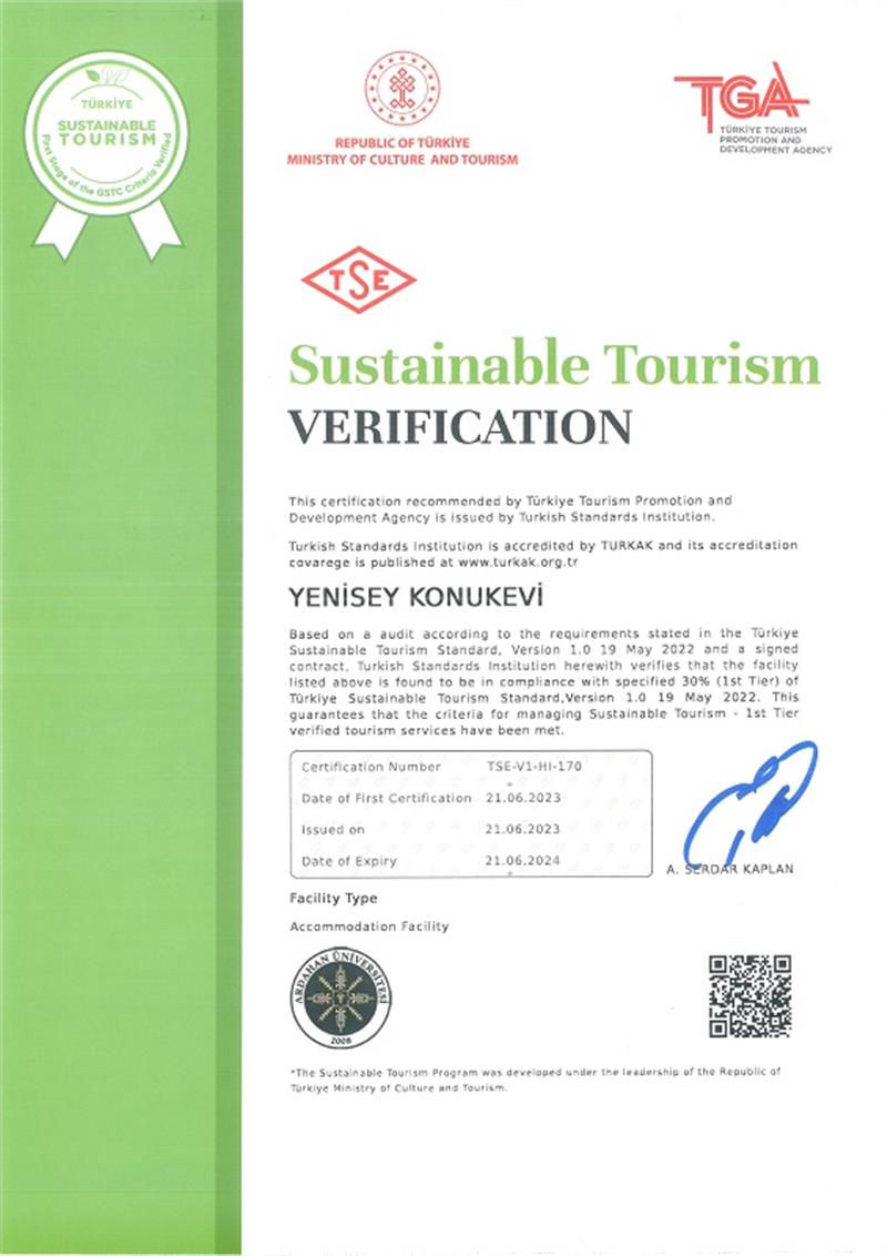 Üniversitemiz Yenisey Konukevi Sürüdürülebilir Turizm 1. Aşama Belgesi Aldı