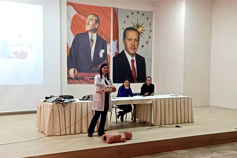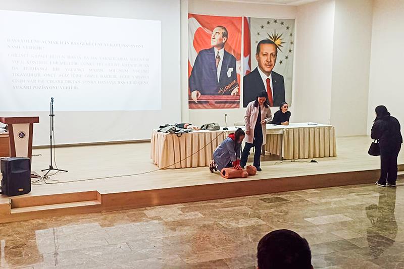Teknik Bilimler Meslek Yüksekokulu personellerinden sonra şimdide öğrencilerine ilk yardım eğitimi verildi. 8 Haziran 2023 tarihinde akademik ve idari personellere verilen ilk yardım eğitiminin çok fazla yararı olması ve Teknik Bilimler Meslek Yüksekokulu Müdürü Doç. Dr. Fatih Ongül’ün önerisiyle öğrencilere verilmek için planlanan ilk yardım eğitimi Teknik Bilimler MYO konferans salonunda gerçekleştirildi. Bu eğitimde öğrencilere; ilk yardım ve önemi hakkında kısa bilgilendirme yapıldıktan sonra bak dinle hisset yönteminin hangi durumlarda yapılması gerektiği, temel yaşam desteği yapmanın neden önemli olduğu, bebeklerde çocuklarda ve yetişkinlerde kalp masajı ve suni solunum farklılıkları ve nasıl yapılması gerektiği, heimlich manevrasının (hava yolu tıkanıklığında) hangi durumlarda ve nasıl yapılması gerektiği, rentek manevrasının (acil durumlarda araç içerisinden kişinin çıkarılması) hangi durumlarda yapılması gerektiği, sara hastası (epilepsi) olan kişilerde yapılması ve yapılmaması gereken davranışların neler olduğu, boğulmalarda kanamalarda şok vb. durumlarda ilk yardımın önemi gibi konulardan bahsedildi. Öğr. Gör. Cansu Karadağ tarafından uygulamalı ilk yardım eğitimi esnasında gönüllü öğrencilere de suni solunum, kalp masajı, heimlich manevrası ile ilgili olarak uygulama yaptırıldı. Eğitim sonunda eğitimde Müdürlük adına görev alan Öğr. Gör. Dr. Raziye Filiz Akkuş, eğitime katkılarından dolayı eğitimi veren Öğr. Gör. Cansu Karadağ’a teşekkürlerine iletti ve eğitim sona erdi.