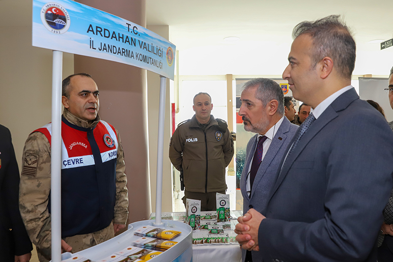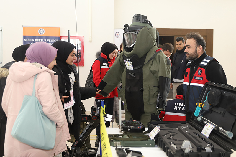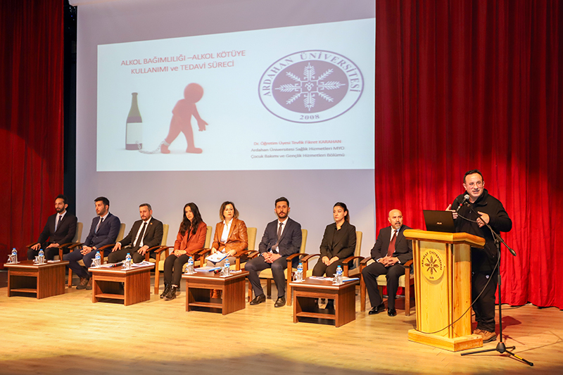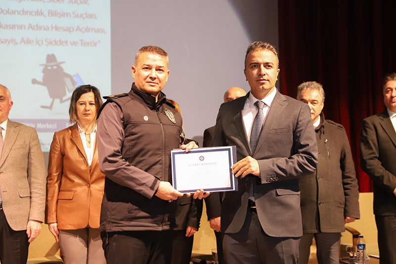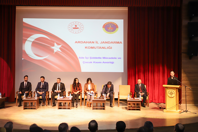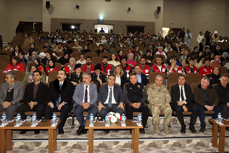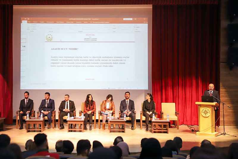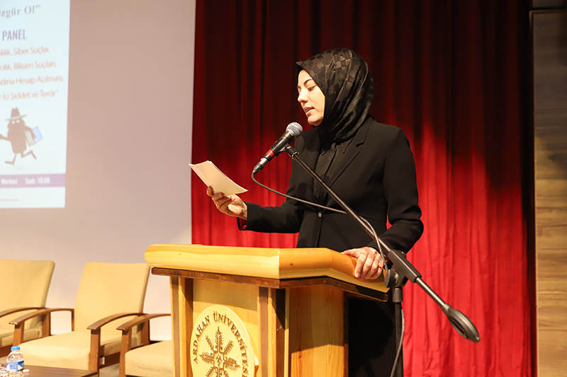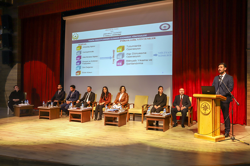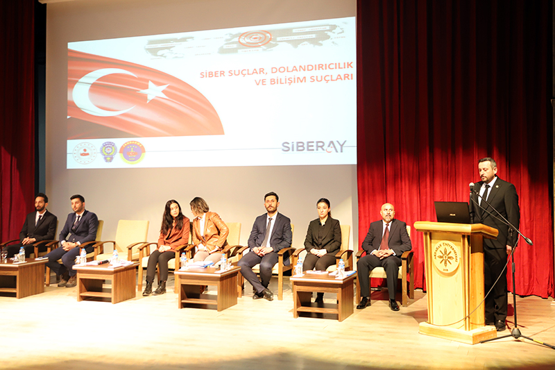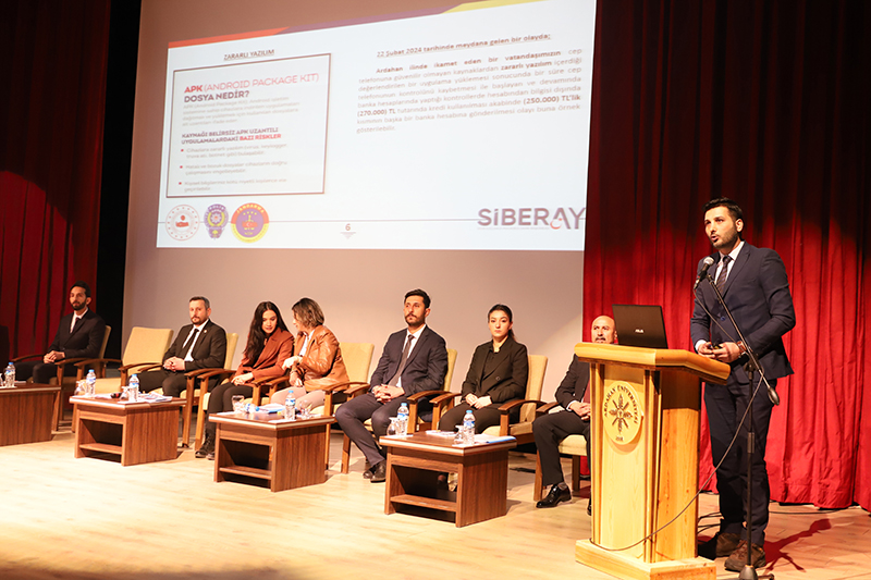 Üniversitemiz ev sahipliğinde İl Jandarma Komutanlığı ve İl Emniyet Müdürlüğü iş birliğiyle Bağımlılık, Siber Suçlar, Dolandırıcılık, Bilişim Suçları, Başkasının Adına Hesap Açılması, Asayiş, Aile İçi Şiddet ve Terör konularını içeren “Bağımlı Olma, Özgür Ol” paneli düzenlendi. Âşık Şenlik Kültür Merkezinde düzenlenen panele; Ardahan Valisi Hayrettin Çiçek, Üniversitemiz Rektörü Prof. Dr. Mehmet Biber, İl Jandarma Komutanı Kıdemli Albay Ramazan Yiğit, İl Emniyet Müdürü Gökalp Şener, Genel Sekreterimiz Kubilay Aras, diğer il protokol üyeleri, STK temsilcileri, akademik-idari personel, öğrenciler ve basın mensupları katıldı. Akademisyen Arş. Gör. Ezgi Oya Malkoç’un sunuculuğunu yaptığı panelin moderatörlüğünü Sağlık Hizmetleri MYO / Çocuk Bakımı ve Gençlik Hizmetleri Bölümü Başkanı Dr. Öğr. Üyesi Tevfik Fikret Karahan üstlendi. Açış konuşmasını gerçekleştiren Rektörümüz Prof. Dr. Mehmet Biber, bilişim sistemlerine yönelik siber saldırılarının günümüz dijital dünyasının en önemli sorunlarından birisi olduğunu vurgulayarak, siber güvenlik ve bağımlılık konularının panelde uzman kişiler tarafından anlatılmasının hem personelimiz hem de öğrencilerimiz için çok yararlı olacağına dikkat çekti. Ardahan Valisi Hayrettin Çiçek ise konuşmasında Türkiye Cumhuriyeti Devleti’nin her alanda vatandaşların güvenliğini sağlamakla yükümlü olduğunu belirterek, yapay zekânın toplum üzerindeki etkisine kısaca değindi. Konuşmalarının ardından panele geçildi. Panelde; Asayiş Şube Müdürlüğü’nde görevli Polis Memuru Serkan Cankurt, Kadın Acil Destek İhbar Sisteminde (KADES) görevli Astsubay Çavuş Nejla Gezici, Terörle Mücadele Şube Müdürlüğü personeli Polis Memuru Mesut Onay, Narkotik (KOM Şube Müdürlüğü) personeli Jandarma Astsubay Başçavuş Burcu Özüt, Jandarma Astsubay Kıdemli Çavuş Hatice Çalışkan, Siber Suçlarla Mücadele Şube Müdürlüğü Jandarma Astsubay Üstçavuş Osman Aydın, Siber Suçlarla Mücadele Şube Müdürlüğü Polis Memuru Murat Bulut, asayiş suçları, aile korunması kanunu, şiddet, KADES uygulaması, terör örgütlerinin eleman kazanma yöntemleri, madde bağımlılığı, narkotik maddelerin sınıflandırılması ile siber suçlar, dolandırıcılık ve bilişim suçları konularında birer sunum gerçekleştirdi. Teşekkür belgesi takdimiyle sona eren programının ardından İl Jandarma Komutanlığı, İl Emniyet Müdürlüğü, Sağlık İl Müdürlüğü, Gençlik ve Spor İl Müdürlüğü, AFAD, İş-Kur, Ticaret İl Müdürlüğü, Ardahan Müftülüğü, Kızılay ve Yeşilay Ardahan Şubelerinin bilgilendirme stantlarının gezildi.