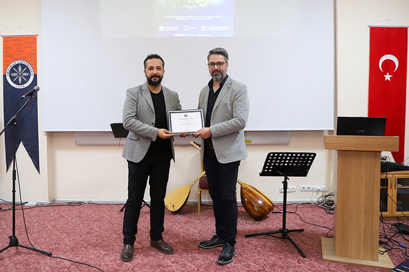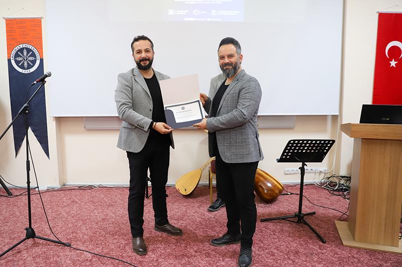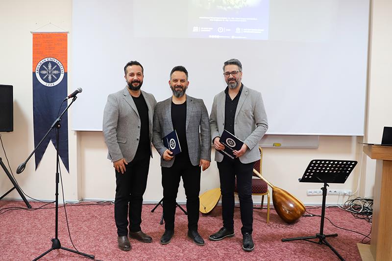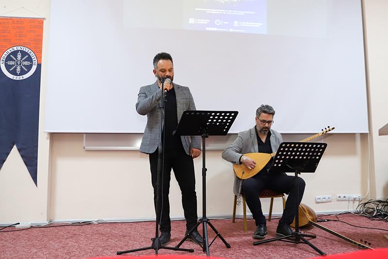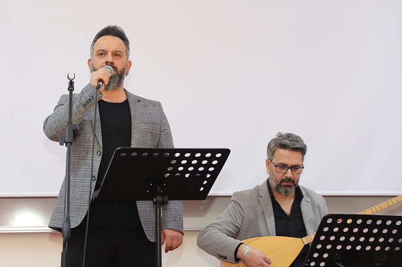 Üniversitemiz Güzel Sanatlar Fakültesi Türk Müziği Bölümü tarafından Arü İBEF Nazım Hikmet Konferans Salonu’nda “Kanlı Destan Çanakkale” konseri düzenlendi. Genel Sanat Yönetmenliği Dr. Öğr. Üyesi Turgay Akdağoğlu’nun yaptığı konsere akademik-idari personel ile öğrenciler katıldı. Türk Müziği Bölümü akademisyenlerimizden Dr. Öğr. Üyesi Turgay Akdağoğlu, Dr. Öğr. Üyesi Kemal Özavcı’nın solo bağlama eşliği ile seçilmiş kahramanlık türkülerinden 12 eser seslendirdi. Konser belge takdiminin ardından çekilen hatıra fotoğrafı ile sona erdi.