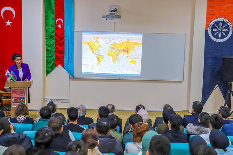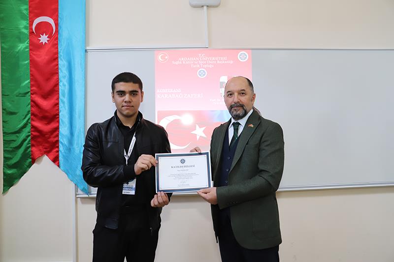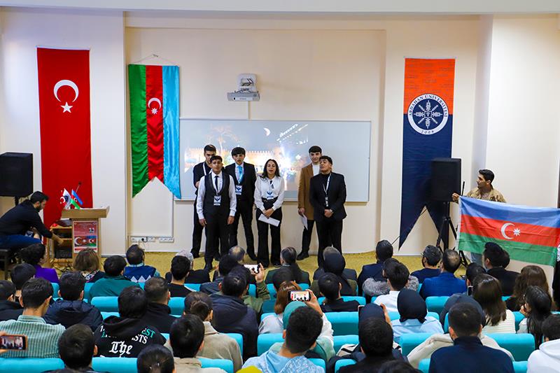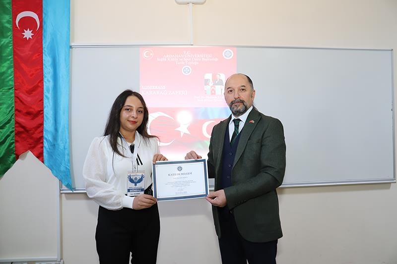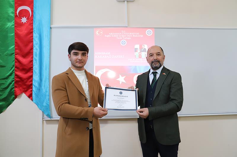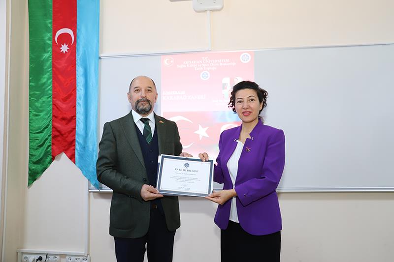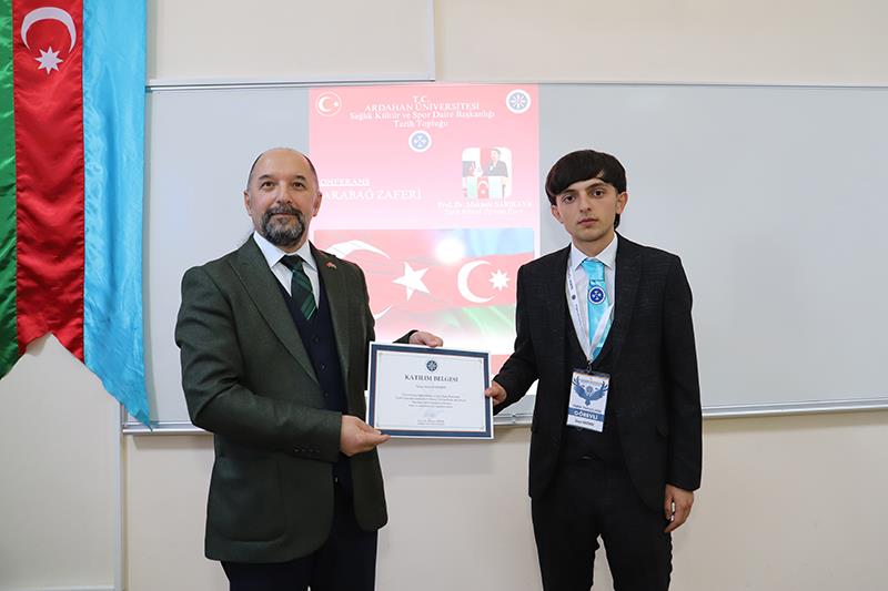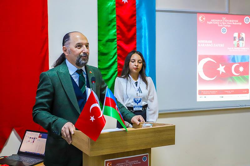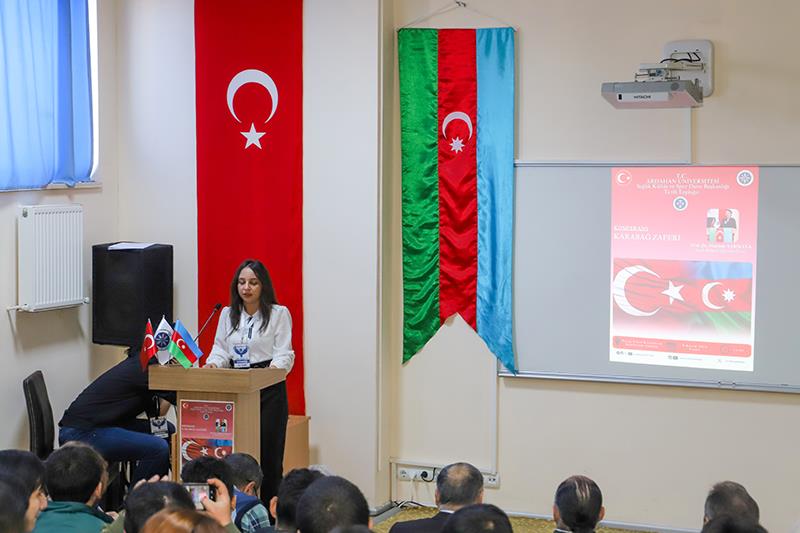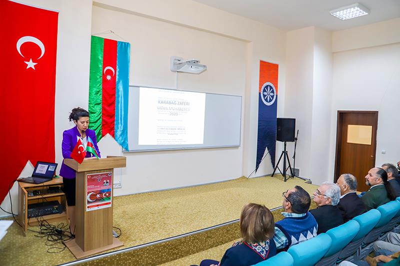 Üniversitemiz Sağlık, Kültür ve Spor Daire Başkanlığı Tarih Topluluğu tarafından Karabağ Zaferi’nin 4. yıl dönümü vesilesiyle bir kutlama programı düzenlendi. Üniversitemiz akademik ve idari personeli ile öğrencilerin katılım sağladığı program, saygı duruşunun ardından İstiklal Marşı ve Azerbaycan Milli Marşı’nın okunmasıyla başladı. Programda İnsani Bilimler ve Edebiyat Fakültesi Tarih Bölümü öğretim üyesi Prof. Dr. Makbule Sarıkaya “Karabağ Zaferi” konulu bir konferans verdi. Konuşmasında Karabağ’ın tarihi süreçteki yerinden bahsederek Türk dünyası ve Kafkasya siyaseti açısından stratejik önemine vurgu yaptı. Konuşma sonrasında Nigar Aslanova, Azer Alizade, Baycan Alizade, Emil Nabiyev, Fayıl Rızayev ve Senan Kerimov adlı Azerbaycanlı öğrenciler; “Karabağ Can Karabağ” mahnısını seslendirdiler. Üniversitemizde öğrenim gören Tarih Topluluğu üyesi Azerbaycanlı öğrencilerin görev aldığı program, yoğun ilgi gördü. Teşekkür belgesi takdiminin ardından, müzik ve danslar eşliğinde devam eden program, hatıra fotoğrafı çekimiyle son buldu.