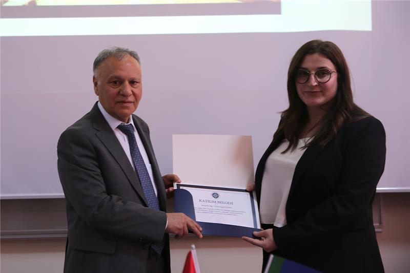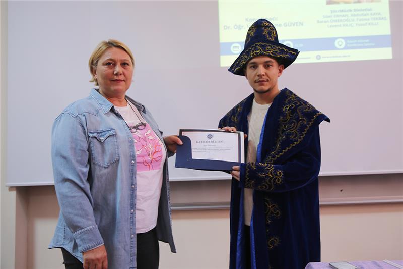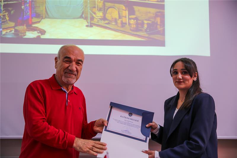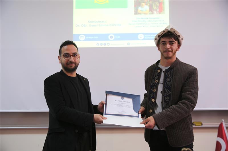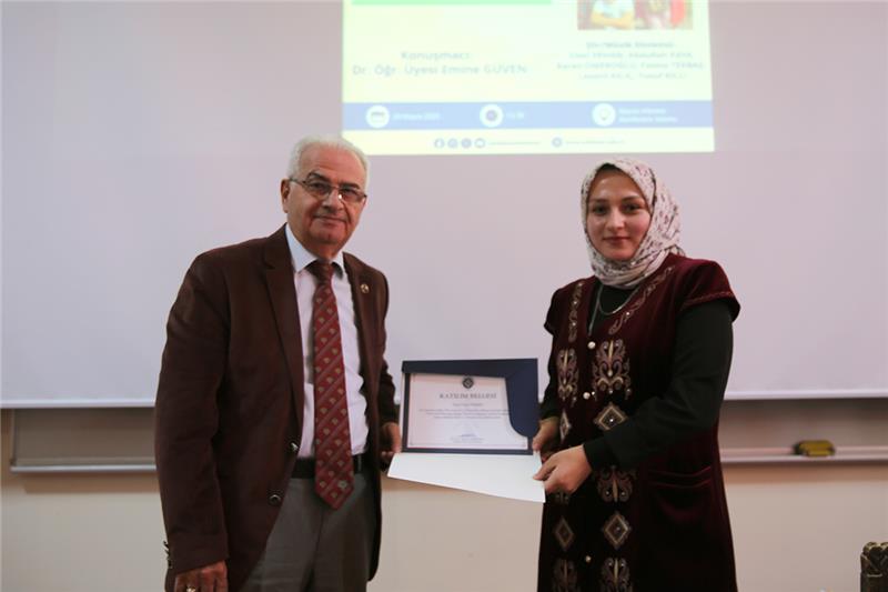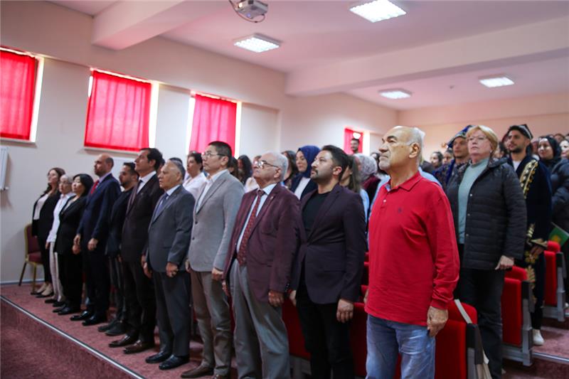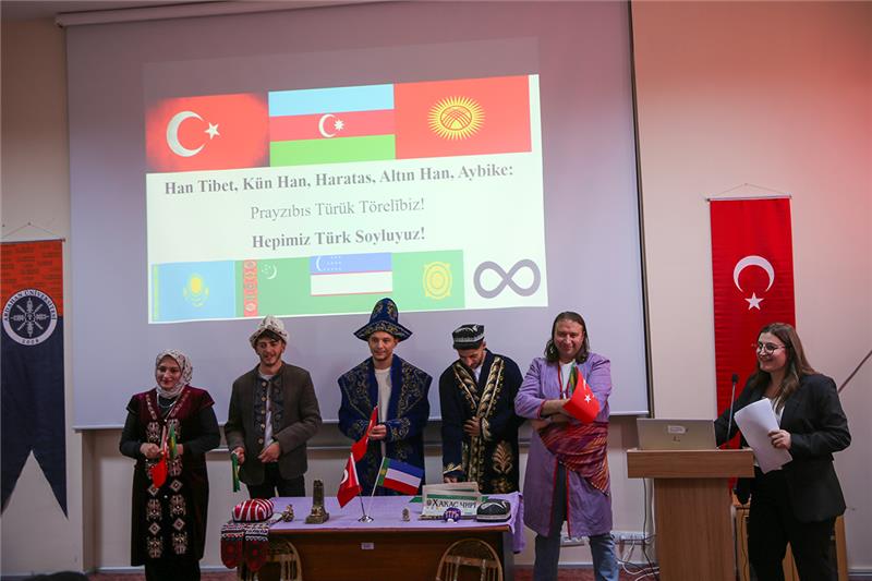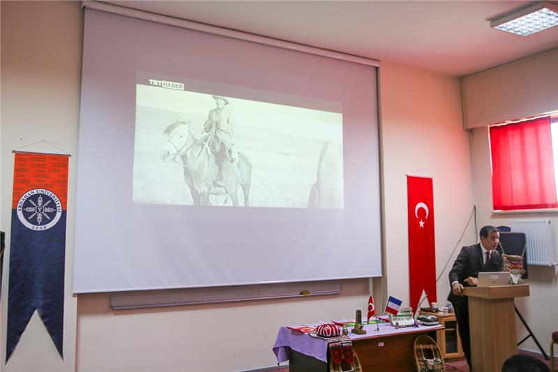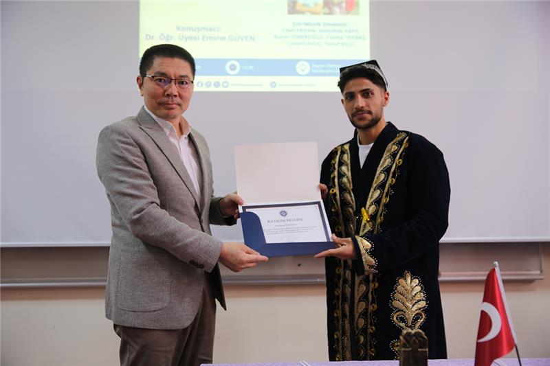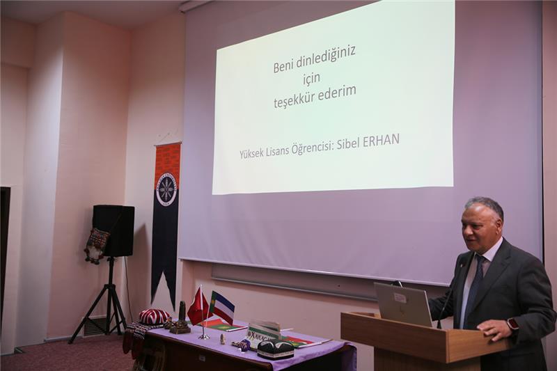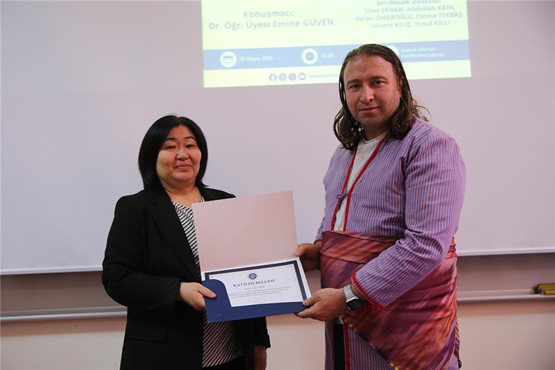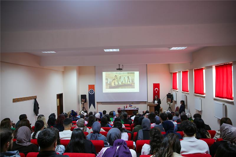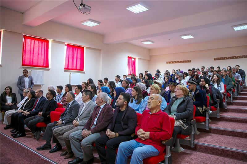 Üniversitemiz Nazım Hikmet Konferans Salonu’nda Çağdaş Türk Lehçeleri ve Edebiyatları Bölümü tarafından “Türk Gönül Dünyamız: Kadim Türk Boyu Hakaslar” konulu konferans gerçekleştirildi. Etkinliğe Ardahan Üniversitesi Rektörü, dekan yardımcıları, akademisyenler ve çok sayıda öğrenci iştirak etti. Saygı duruşu, Türk ve Hakas Millî Marşlarının söylenmesinin ardından Rektörümüz Prof. Dr. Öztürk Emiroğlu açılış konuşması gerçekleştirdi. Rektörümüz konuşmasında Hakasların dil ve kültürünün Türk dünyasındaki yeri ve önemine vurgu yaptı. Bu alanda yapılacak tarihî ve kültürel çalışmaların önemine değindi. Ardından Dr. Öğretim Üyesi Emine Güven konuşmasında Hakas Türklerinin tarihi kökenleri, kültürel mirası ve Türk dünyasındaki yeri üzerine kapsamlı bilgiler paylaştı. Hakasların dili, edebiyatı ve inanç dünyasına dair önemli değerlendirmelerde bulundu. Yüksek Lisan Öğrencisi Sibel Erhan ise sunumunda Hakasların tarihî, kültürel mekânları ve yemek kültürü hakkında bilgiler verdi. Bölüm öğrencileri tarafından Hakas Türkçesinden bir kesit sergilendi. Rektörümüz başta olmak üzere dekan yardımcıları, öğretim üyeleri ve çok sayıda öğrencinin katılım gösterdiği konferans, üniversitenin Türk dünyasıyla olan bağını güçlendiren nitelikte bir kültürel etkinlik olarak değerlendirildi. Etkinlik, Türk dünyasına olan aidiyetin ve ortak kültürel mirasın vurgulanması açısından büyük önem taşırken, katılımcılar tarafından ilgiyle takip edildi. Konferans sonunda konuşmacılara teşekkür belgeleri takdim edildi.