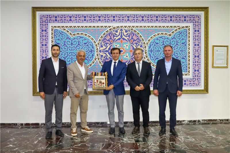 Ardahan İl Özel İdaresi Genel Sekreter Yardımcısı Levent Dursun, İnsan Kaynakları Müdürü İsrafil Bölük, Yazı İşleri Müdürü Fevzi Bozkurt ile İşletme ve İştirakler Müdürü Hükümdar Baydar, Üniversitemiz Rektörü Prof. Dr. Öztürk Emiroğlu’nu makamında ziyaret etti. Ziyaret sırasında İl Özel İdaresi yetkilileri, Rektörümüze “Ardahan” yazılı minyatür bir halı hediye etti. Rektörümüz, nazik ziyaretleri ve anlamlı hediyeleri dolayısıyla İl Özel İdaresi yetkililerine teşekkür ederek, üniversitemizin kamu kurumlarıyla iş birliğine büyük önem verdiğini ifade etti. Ziyaret, karşılıklı iyi dileklerin paylaşılmasının ardından hatıra fotoğrafı çekimiyle sona erdi.