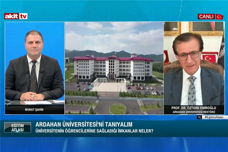 Rektörümüz Prof. Dr. Öztürk Emiroğlu, Akit TV’de yayınlanan “Eğitim Atlası” programında üniversitemizin akademik vizyonunu, öğrencilere sunduğu imkânları, bölgesel kalkınmaya katkı projelerini ve geleceğe yönelik hedeflerini anlattı. Tarım ve hayvancılık alanında ihtisaslaşma planlarından uluslararası iş birliklerine kadar birçok başlık canlı yayında kamuoyuyla paylaşıldı. Prof. Dr. Emiroğlu, üniversitemizin serhat şehri Ardahan’da, Kafkasya’ya açılan stratejik bir konumda yer aldığını vurgulayarak, “Doğayla iç içe huzurlu kampüsümüzde, genç ve dinamik akademik kadromuzla öğrencilerimize nitelikli bir eğitim sunuyoruz. Misyonumuz, yerel değerlerle evrensel bilgi arasında köprü kurmak” dedi.
